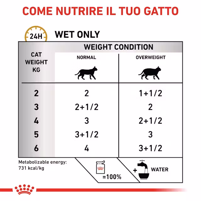 Il basso contenuto energetico consente una gestione nutrizionale ottimale nei gatti con tendenza ad aumentare di peso. L’alimento è da somministrare solo sotto controllo veterinario.
