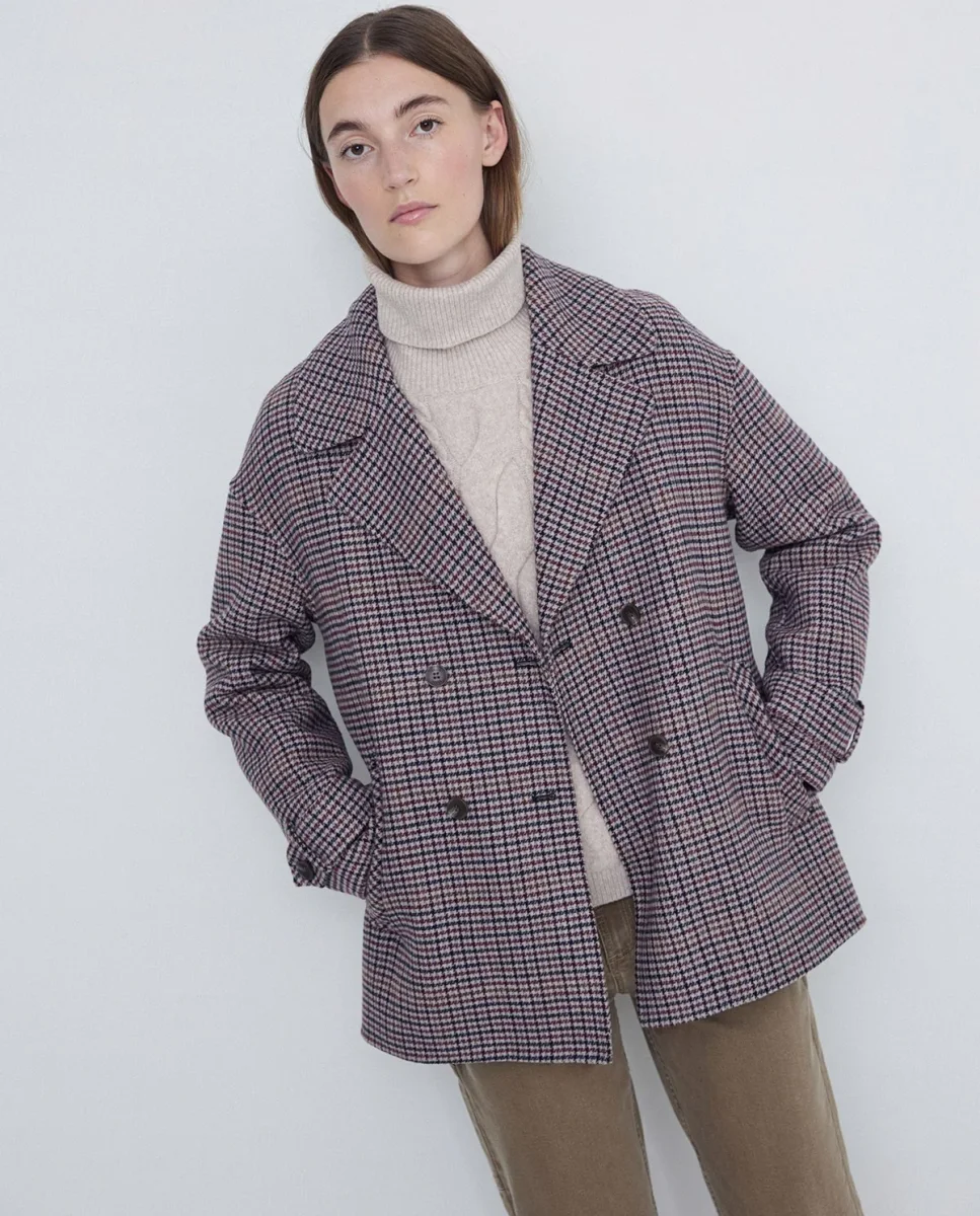 Dettaglio di sovrapposizione in tessuto regolabile con allacciature. Spacchi laterali. Chiusura laterale con cerniera nascosta nella cucitura.