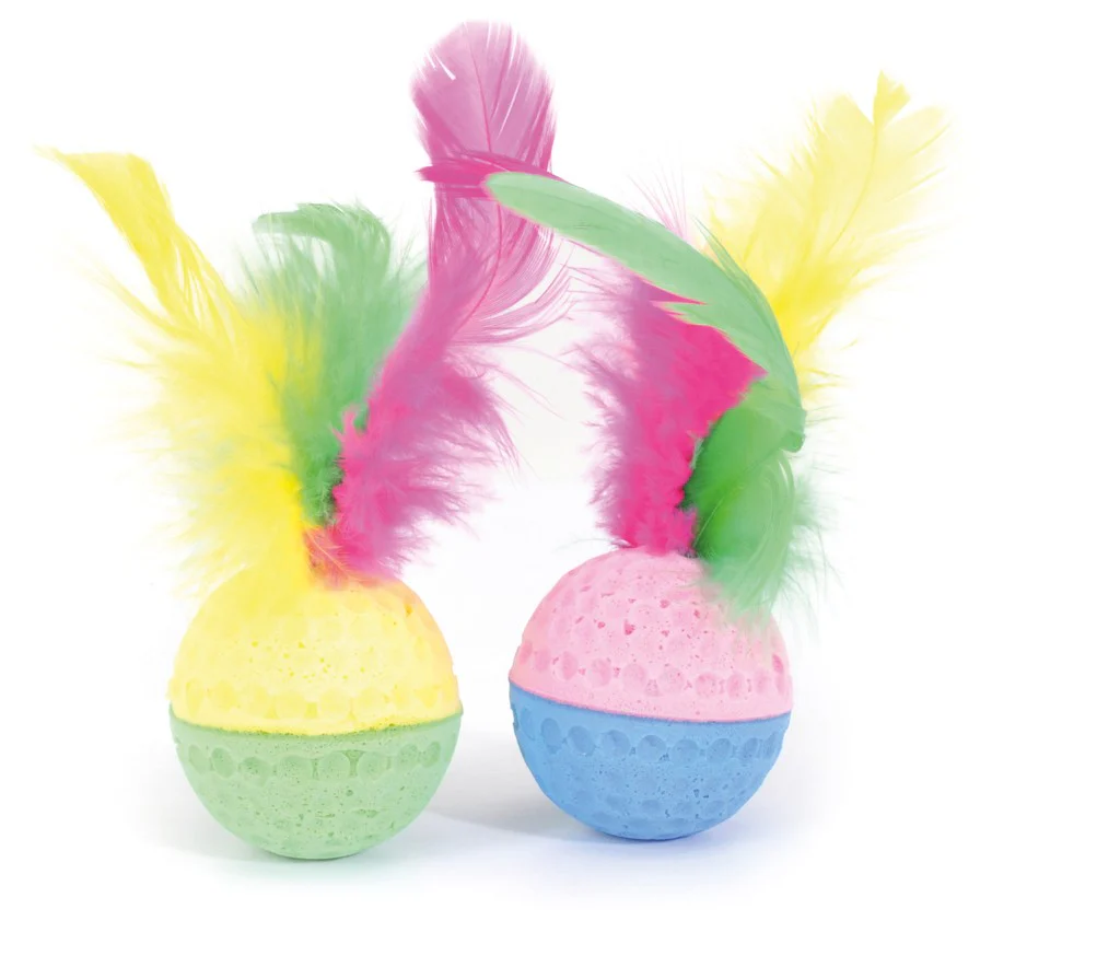 Divertenti palline colorate in morbida spugna con piume decorative, perfette per stimolare l’istinto di caccia e il movimento del tuo gatto. Rimbalzano in modo imprevedibile per ore di gioco.