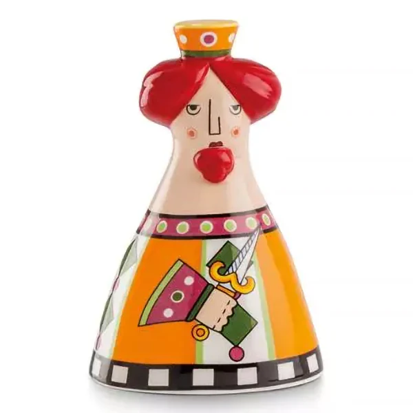 La forma stilizzata del Re o della Regina cattura l’essenza della nobiltà e della regalità, con linee pulite e armoniose che conferiscono un senso di maestosità all’oggetto. La ceramica smaltata, con il suo splendore vibrante, aggiunge una lucentezza vivace alla superficie della campanella, rendendola ancora più affascinante e attraente.