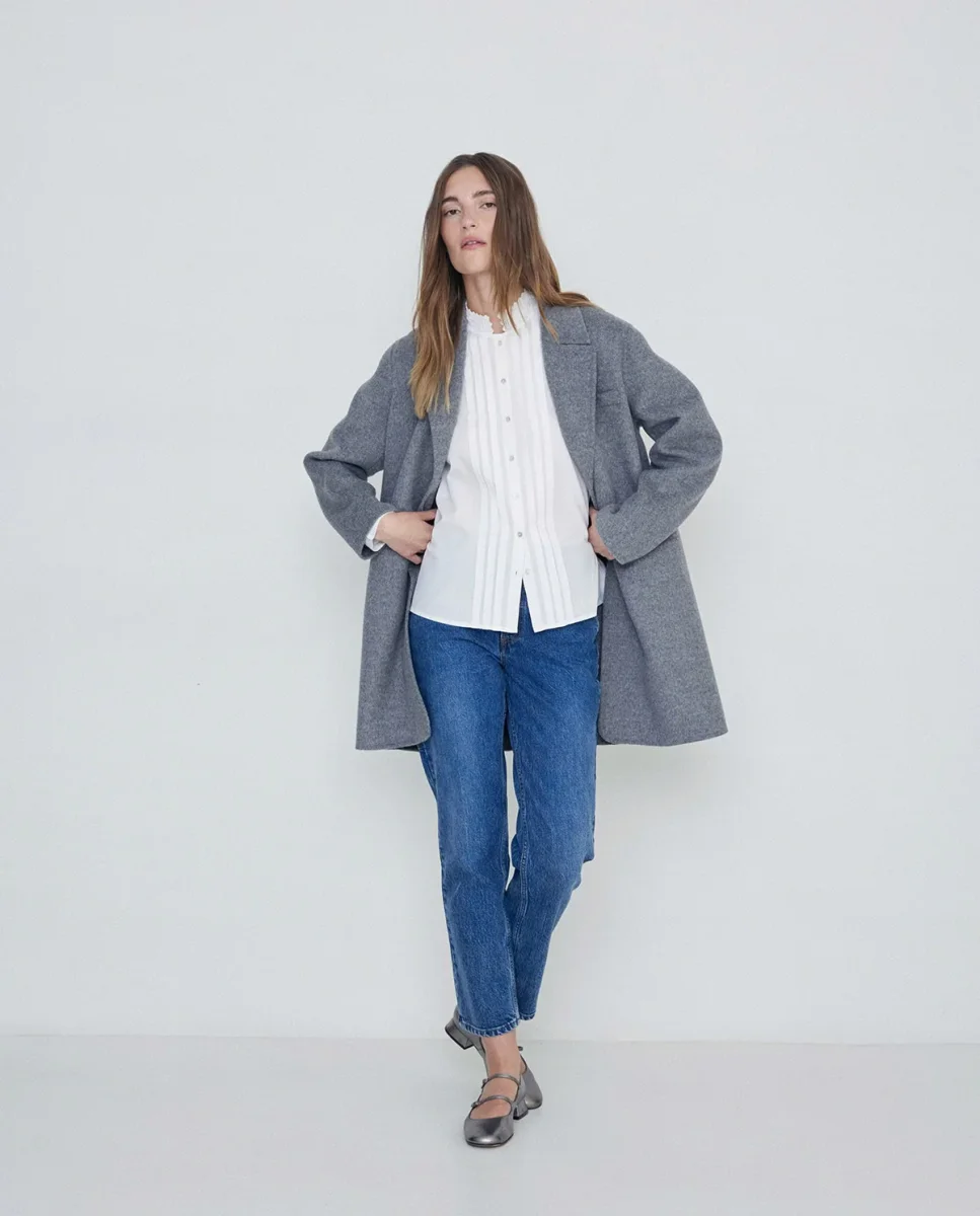 Collo a revers e maniche lunghe. Chiusura frontale con bottoni.