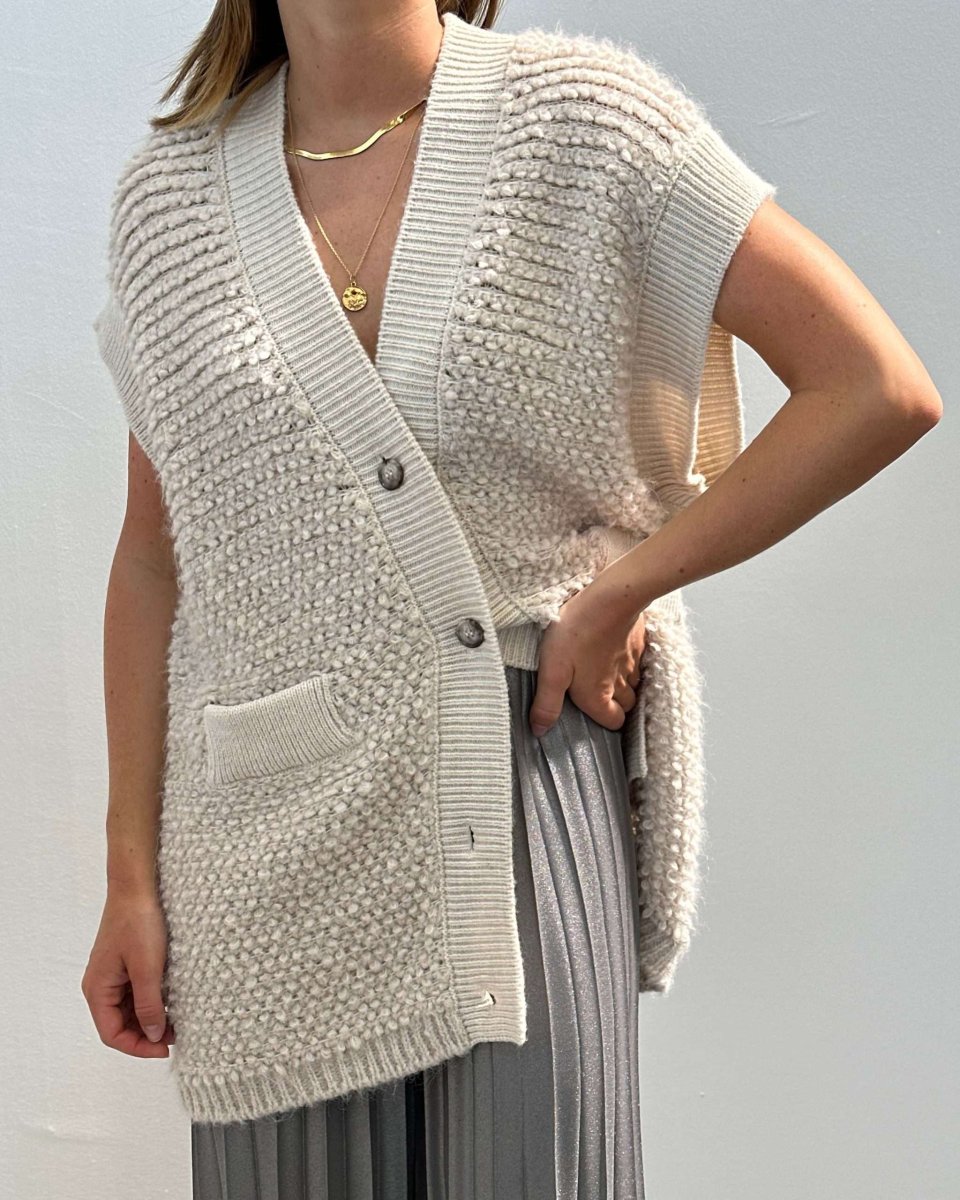 Cardigan smanicato in filato di misto alpaca effetto bouclé, con dettagli in maglia a coste su collo, maniche, tasche finte e orlo fondo.