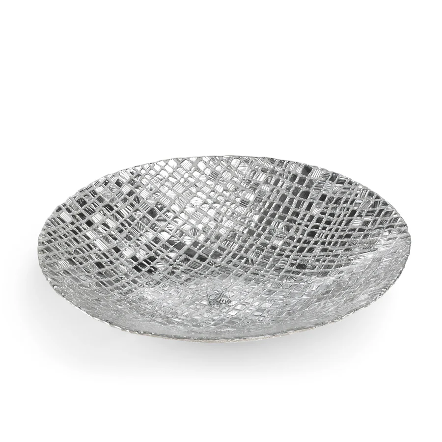La Ciotola in vetro decorato Graticolato di Fantin Argenti, disponibile in tre dimensioni con diametri di 21 cm, 30 cm e 40 cm, è una straordinaria combinazione di artigianato sofisticato e design moderno. Realizzata in vetro di alta qualità, questa ciotola è impreziosita da un elegante motivo graticolato in argento che avvolge la superficie, creando un effetto intrecciato di grande raffinatezza.