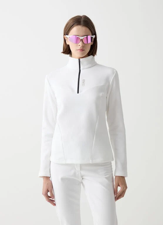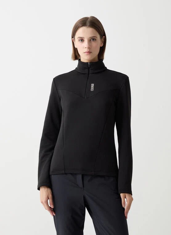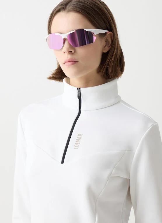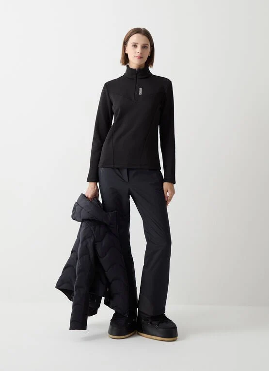 Maglia termica da donna con apertura a mezza zip realizzata in pile stretch liscio all’esterno e garzato internamente. Tagli geometrici, decisi che esaltano la silhouette senza sacrificarne l’armonia. Confort e praticità per un capo tecnico dedicato alle sciatrici che non rinunciano ad un pizzico di femminilità durante l’attività sportiva.