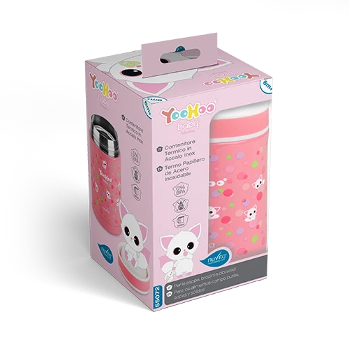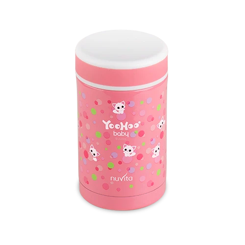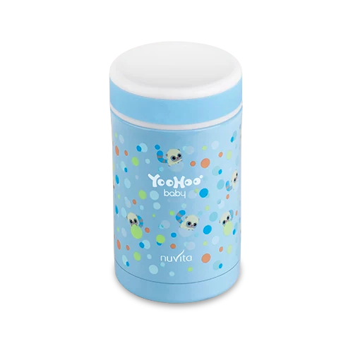 Contenitore termico in acciaio Inox con doppia parete isolante e tappo ermetico. Mantiene caldo fino a 5 ore o freddo fino a 6 ore. Ideale per pappe, brodo, acqua, latte.