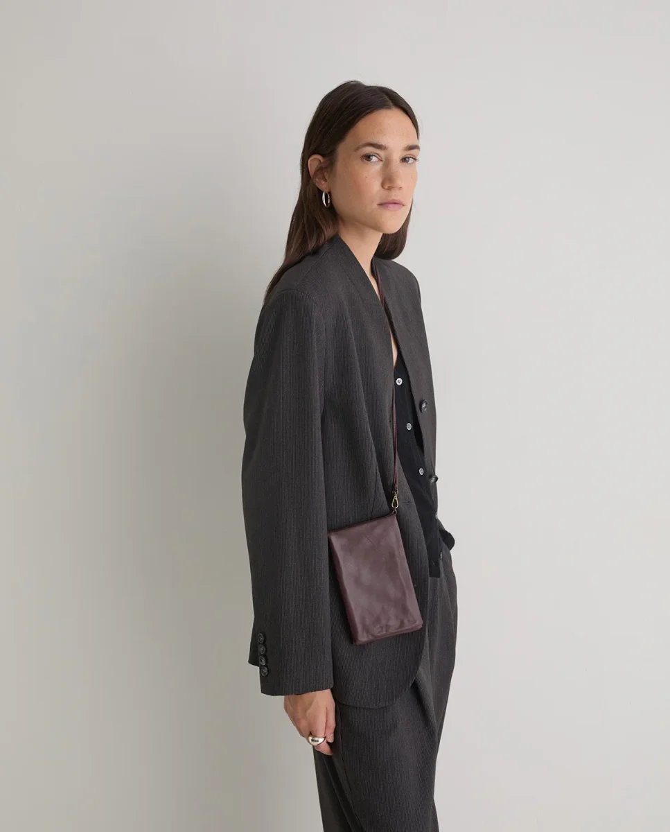 Custodia per cellulare in 100% pelle. Tracolla rimovibile. Chiusura a scatto. Tasca interna con cerniera e porta carte. Scomparti interni.