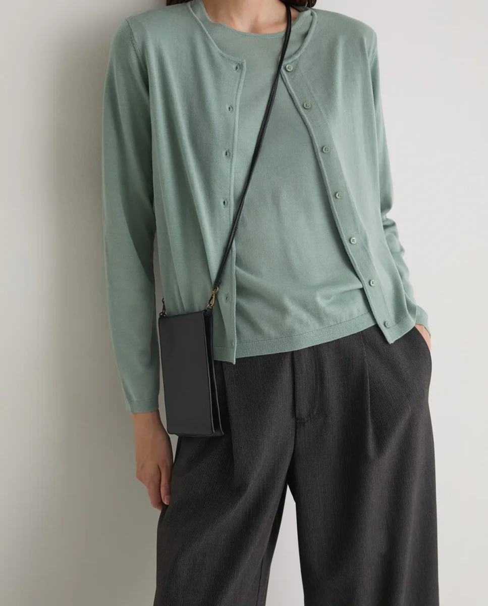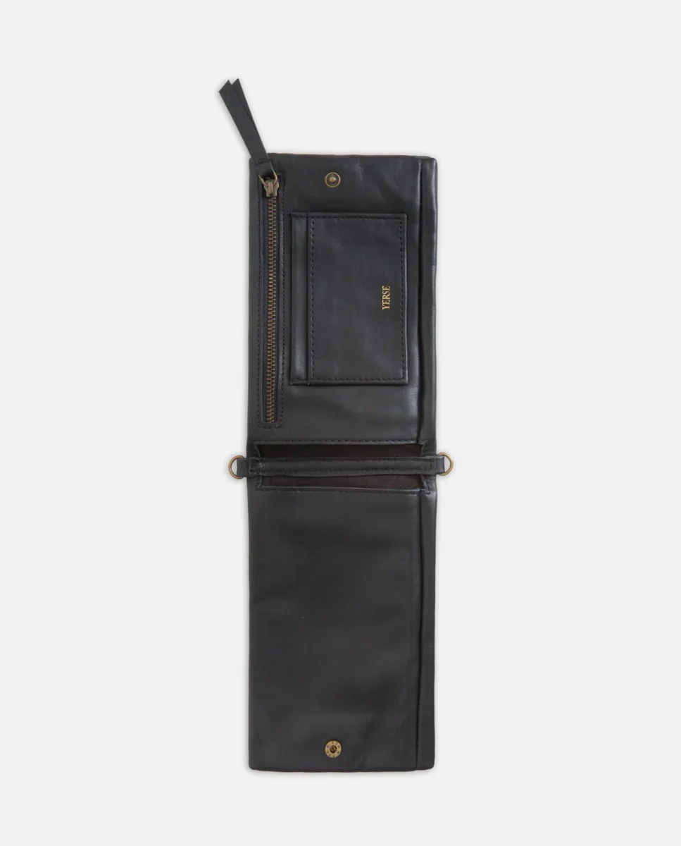 Custodia per cellulare in 100% pelle. Tracolla rimovibile. Chiusura a scatto. Tasca interna con cerniera e porta carte. Scomparti interni.