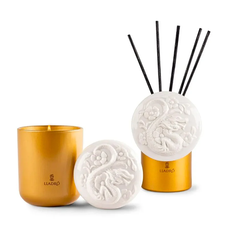 Il Diffusore Dragone è stato creato per riflettere queste qualità uniche attraverso un design raffinato e una fragranza esclusiva. L’elegante recipiente in vetro colore oro è sormontato da un coperchio in porcellana bianca, ornato da un’incisione artistica di un dragone che combina finiture brillanti e opache. Questo dettaglio distintivo rende il diffusore non solo un accessorio funzionale, ma anche un elemento decorativo di grande impatto visivo.