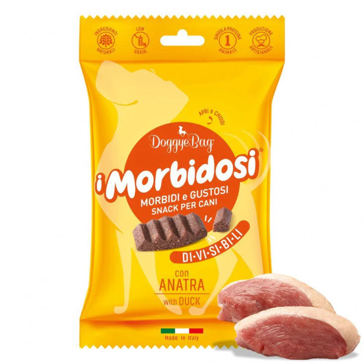 DoggyeBag I Morbidosi con Anatra sono snack morbidi e gustosi perfetti per premiare il tuo cane in ogni momento della giornata. La loro forma innovativa consente di spezzettarli facilmente in bon bon di diverse dimensioni, adattandosi così alle esigenze di cani di tutte le taglie e età. Realizzati con una singola proteina animale e a basso contenuto di cereali (Low Grain), sono ideali sia come snack fuori pasto che durante l’addestramento. La pratica confezione con chiusura “apri e chiudi salvafreschezza” garantisce la massima freschezza. 100% Made in Italy.