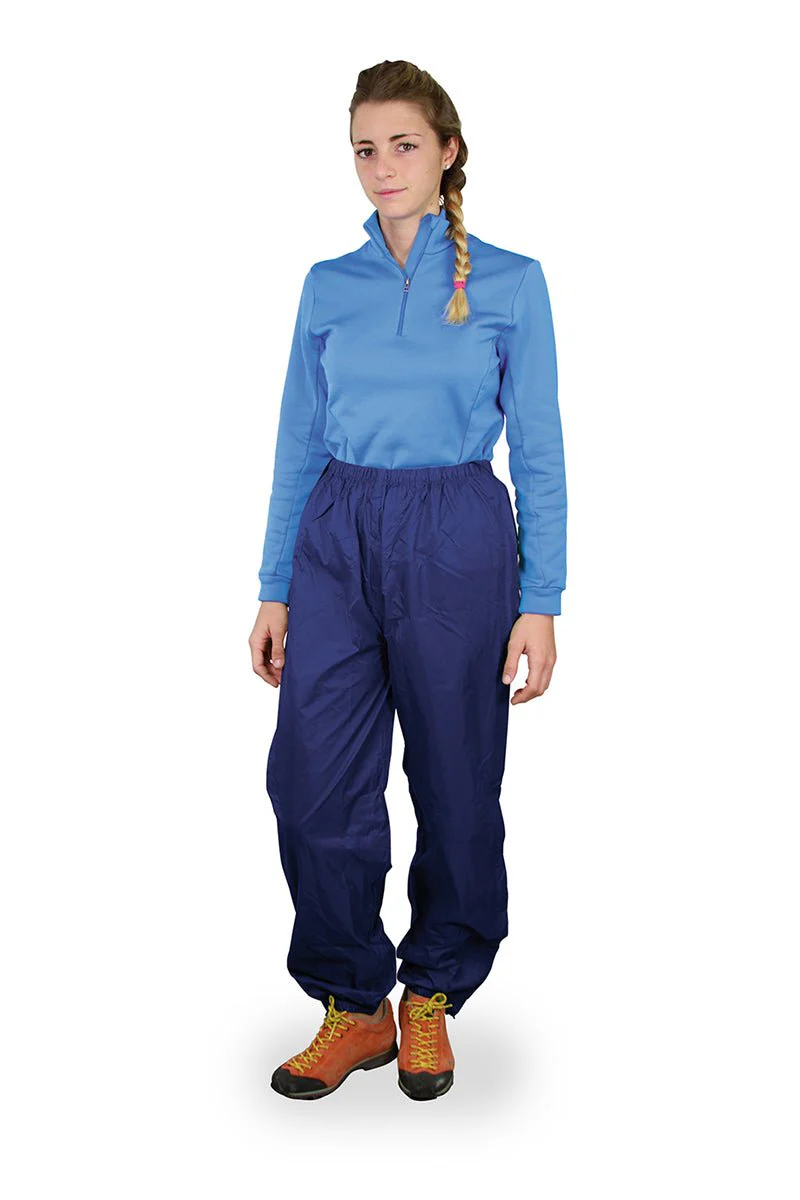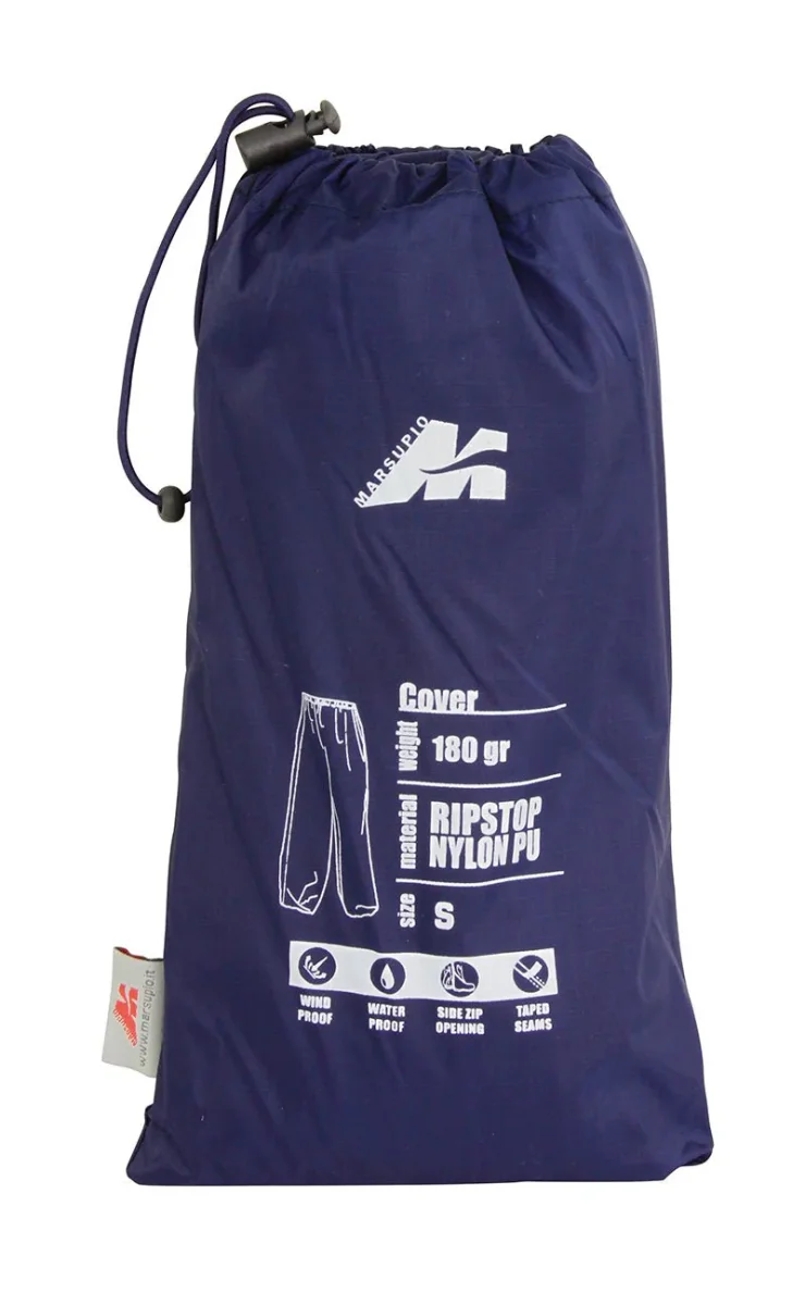 Pantaloni impermeabili, estremamente leggeri e termosaldati. L’impermeabilità di questo tessuto è di 3.000 mm Schmerber: significa che resiste alla pressione esercitata da 3.000 mm di colonna d’acqua (test standard ISO). Dotato di apertura laterale a cerniera. Richiudibili in un comodo sacchetto.