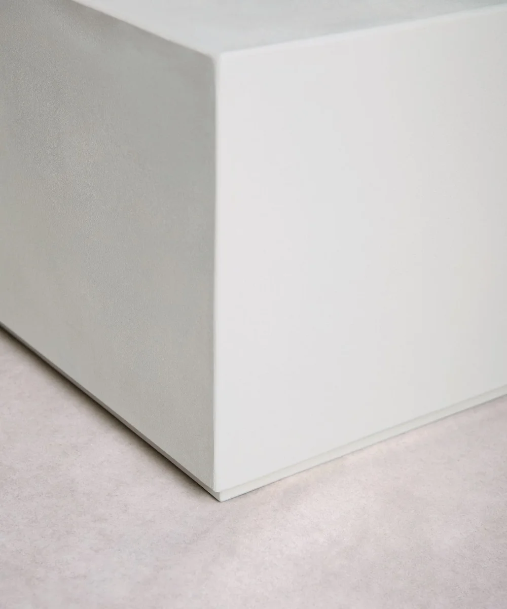 Fabricada en microcemento, este material no solo aporta un acabado uniforme y elegante, sino también resistencia y durabilidad para el uso diario. Su superficie amplia permite colocar libros, bandejas o elementos decorativos con comodidad, mientras su estructura sólida refuerza una sensación de estabilidad y calidad.