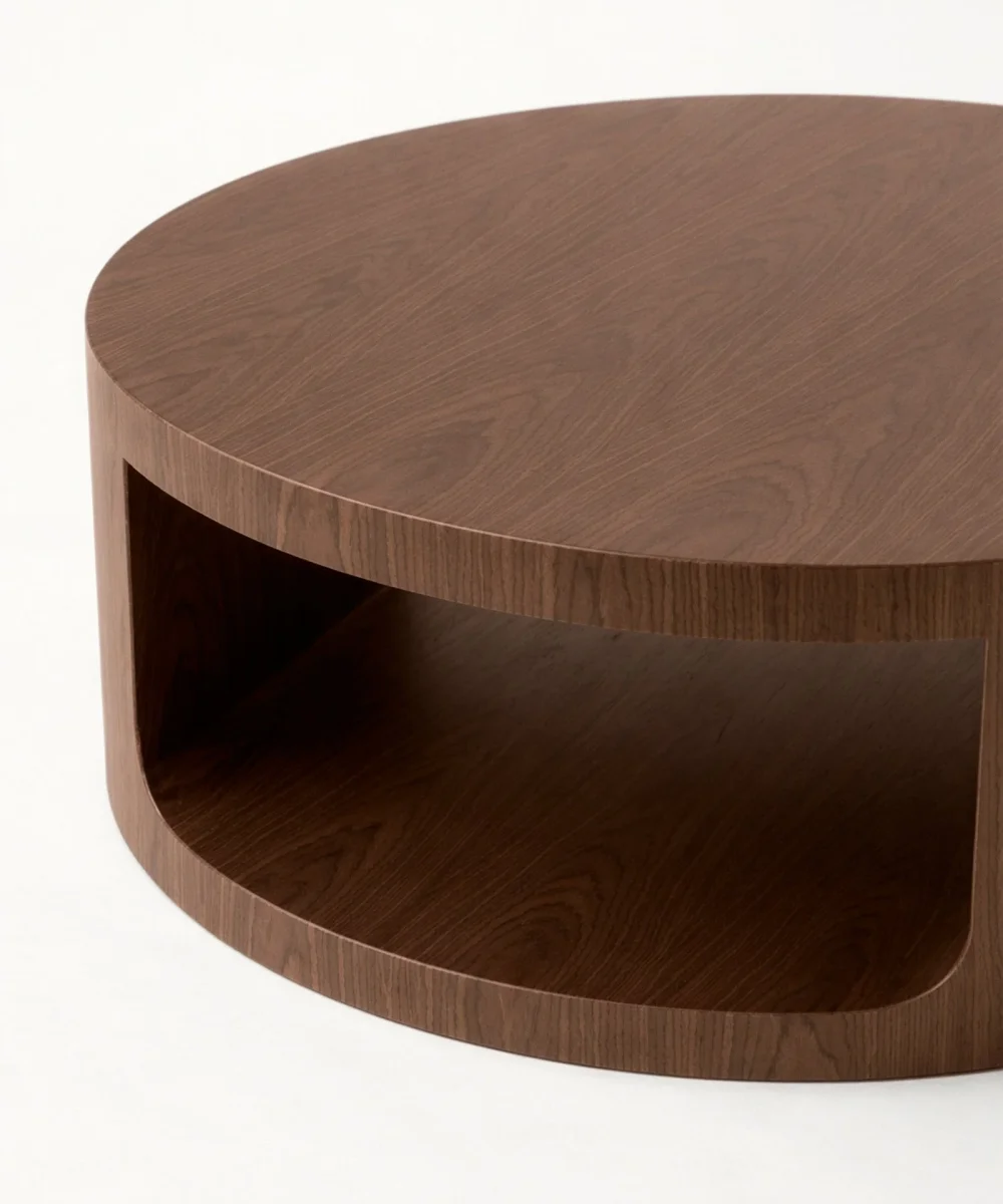 La mesa de centro Basset destaca por su diseño contemporáneo de líneas limpias y su elegante acabado en madera en tono nogal, aportando calidez y sofisticación al salón. Su forma compacta y proporciones equilibradas la convierten en una mesa de centro moderna ideal para espacios que buscan funcionalidad sin renunciar al estilo.