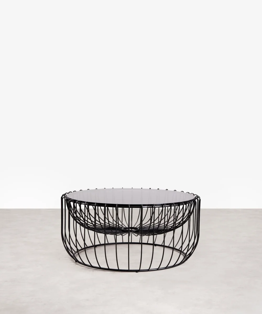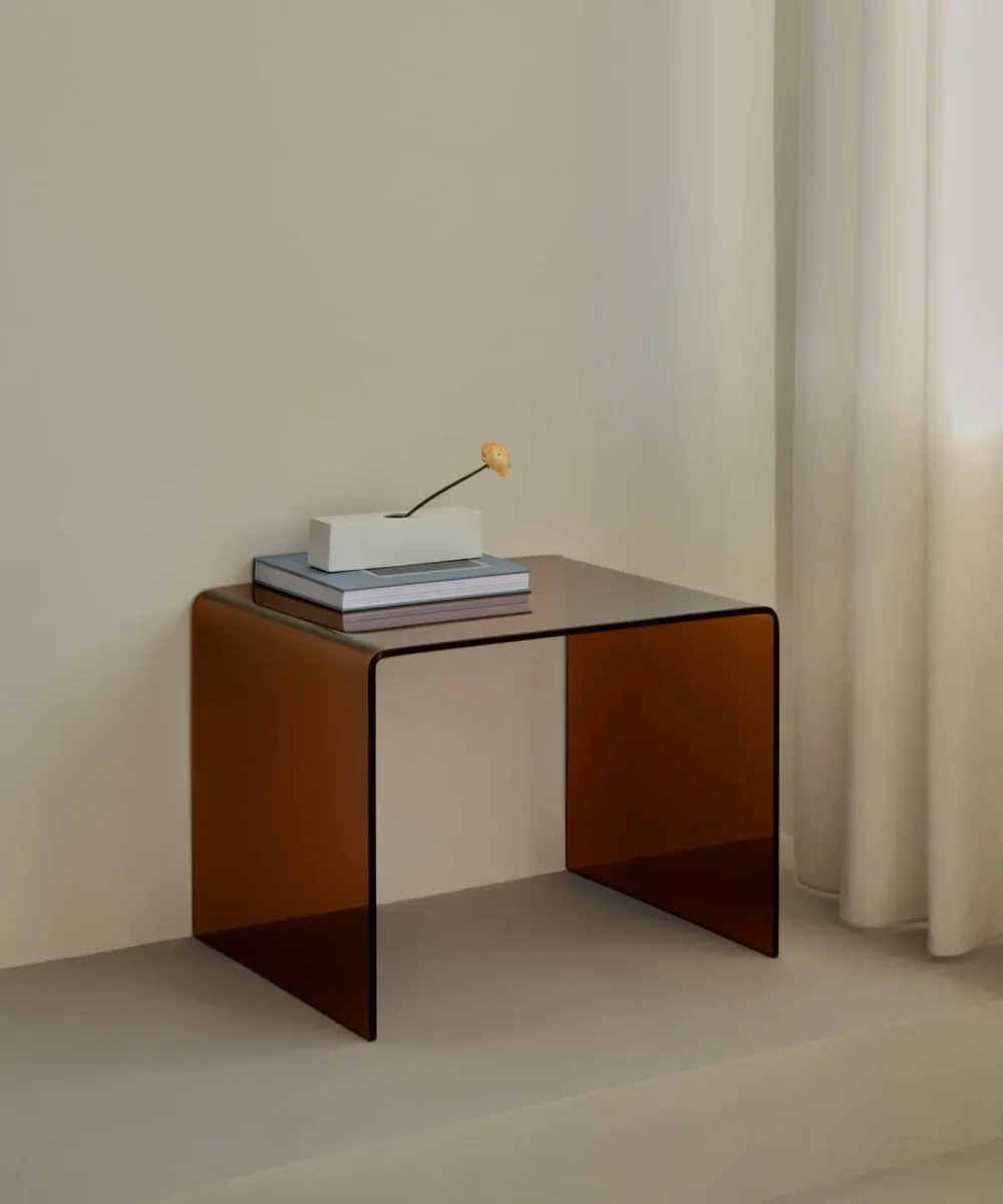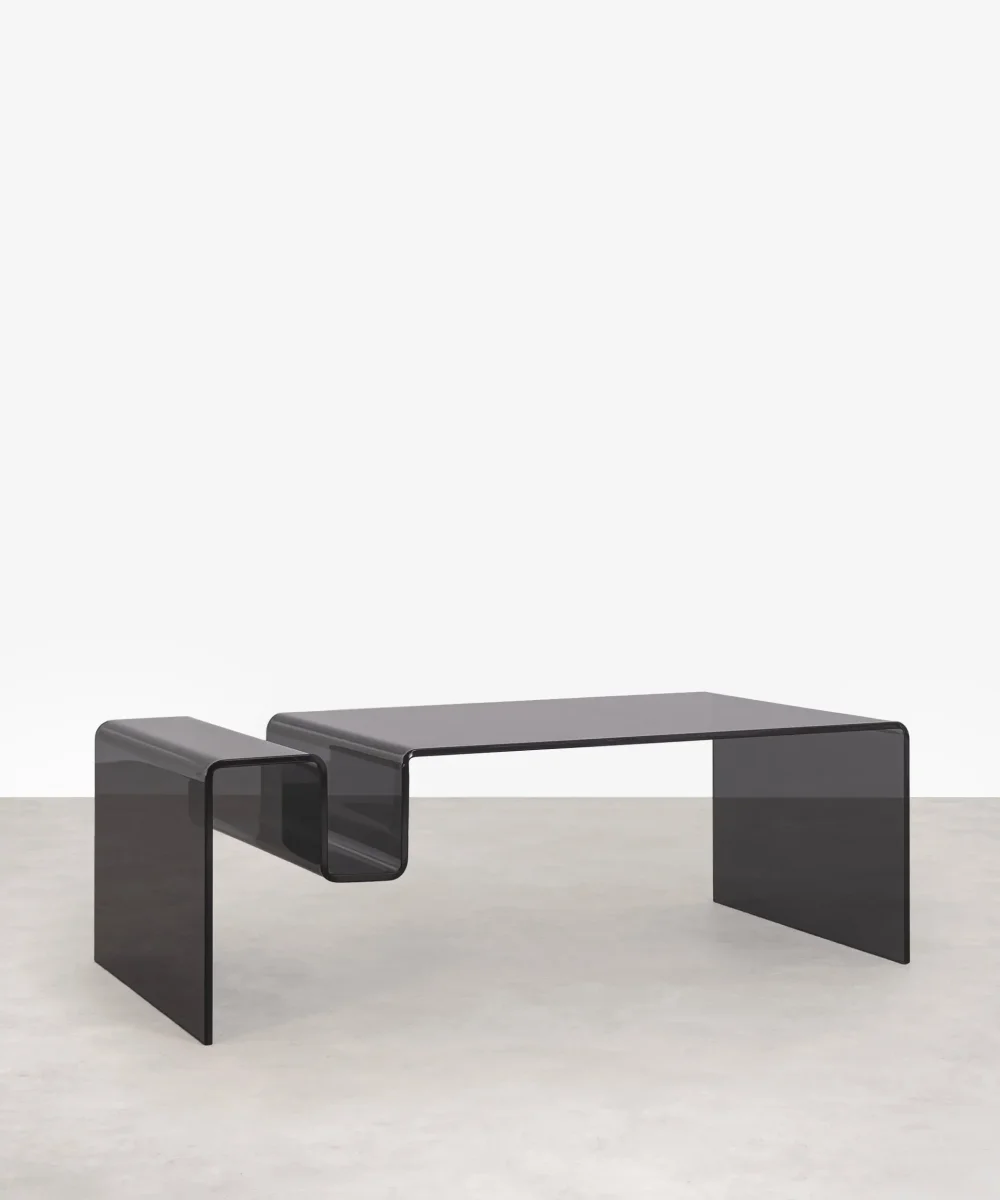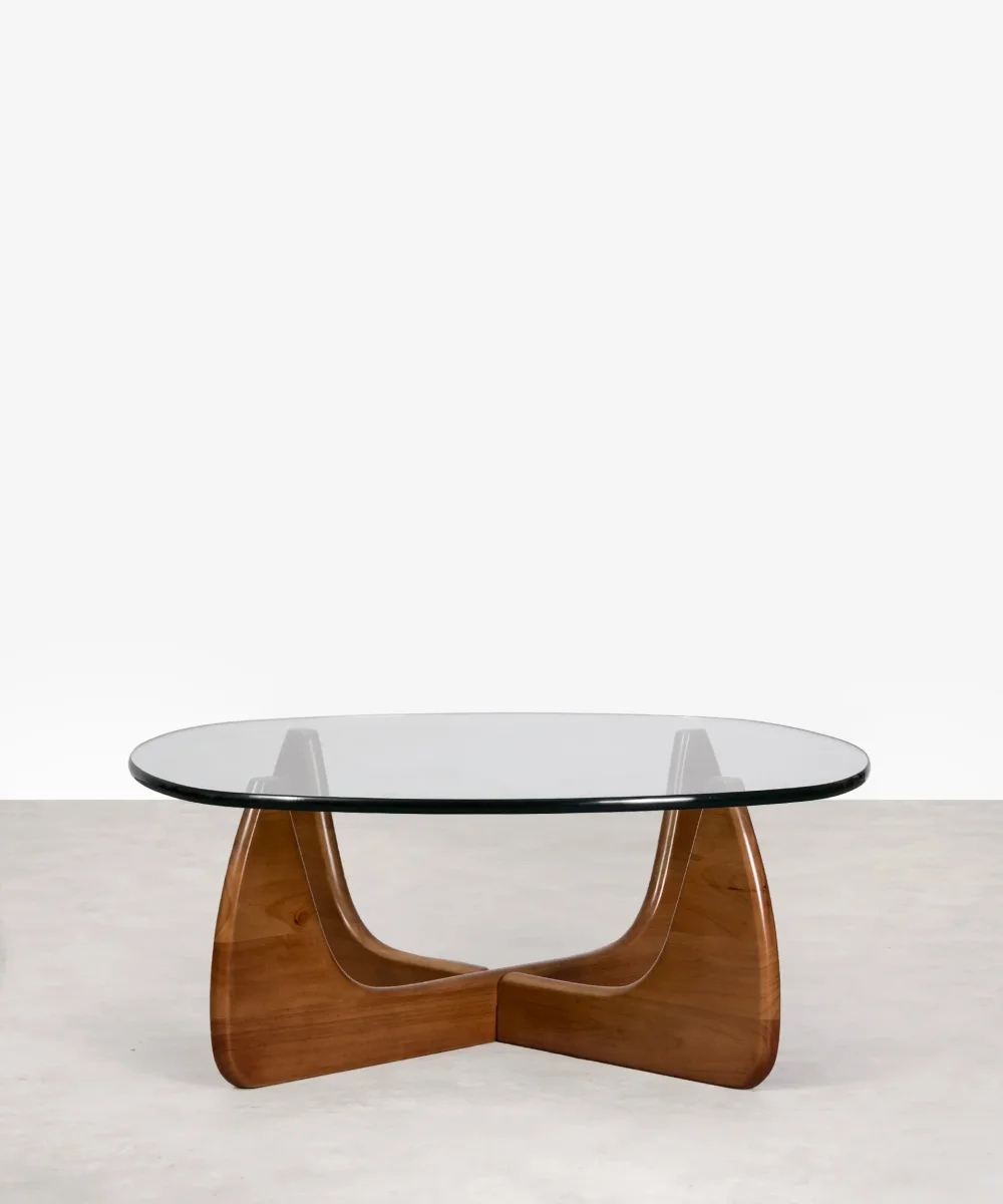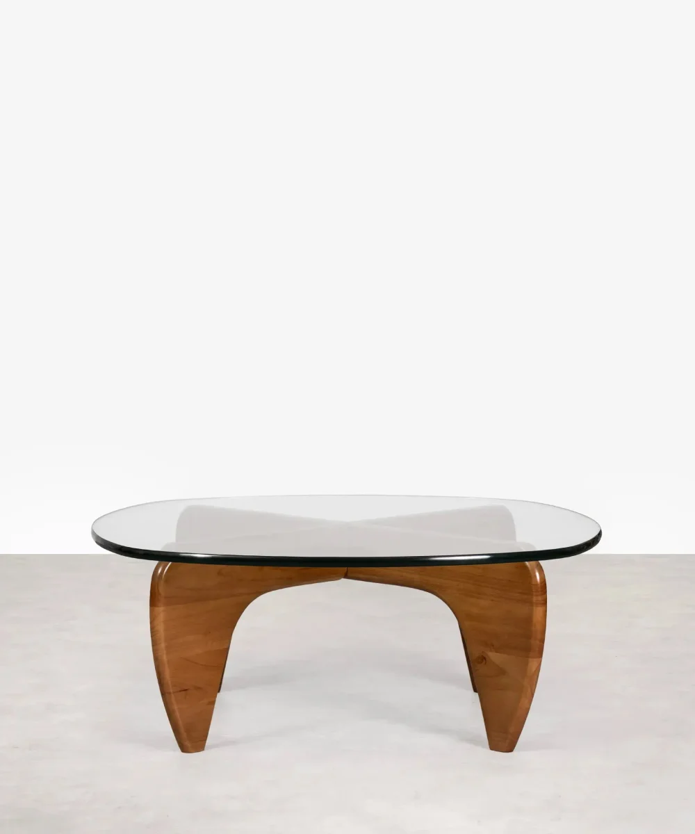 Esta mesa de centro de cristal está fabricada íntegramente en cristal curvado de 19 mm de espesor, que se apoya sobre dos patas de madera maciza esculpida.