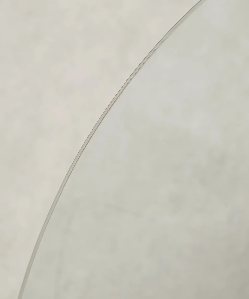 La parte superior es una superficie redonda de cristal, que aporta ligereza visual y permite apreciar la base desde cualquier ángulo. Esta combinación crea un contraste armónico, logrando una pieza elegante y versátil.