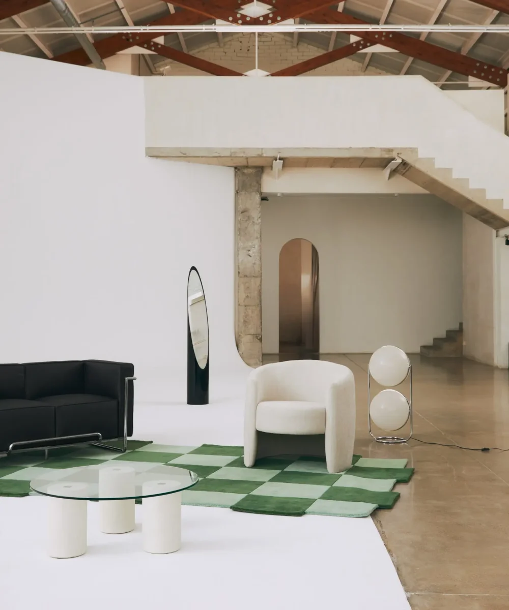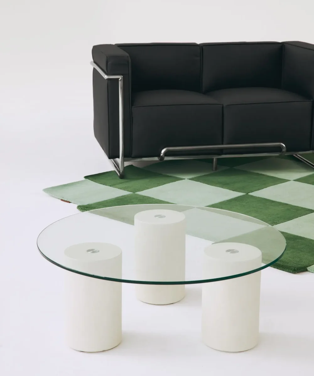 La mesa de centro Nora destaca por su diseño moderno y equilibrado, que combina materiales de calidad y formas simples. Su base está formada por tres patas cilíndricas disponibles en dos acabados: microcemento blanco roto o madera de nogal.