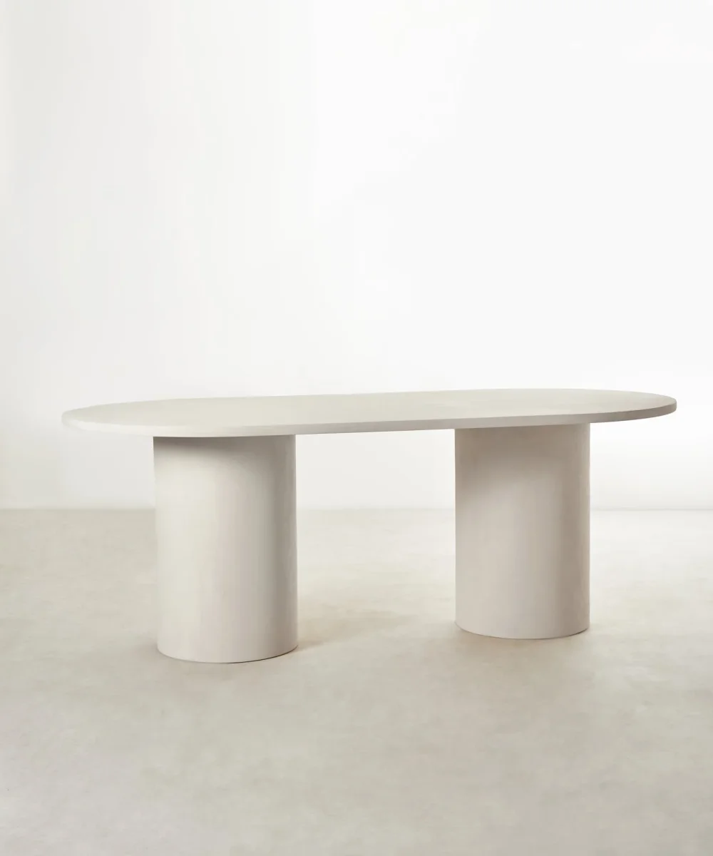 La mesa de comedor Ovalada Juno destaca por su diseño minimalista y elegante. Está formada por un sobre de forma ovalada apoyado sobre dos bases cilíndricas robustas. Su acabado en tono blanco roto aporta luminosidad y un estilo contemporáneo que combina fácilmente con cualquier tipo de decoración.