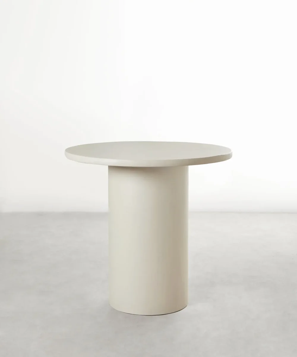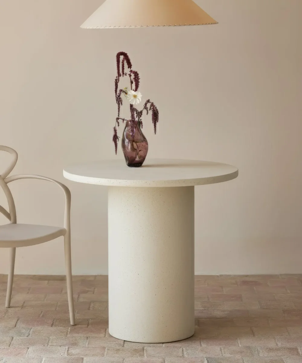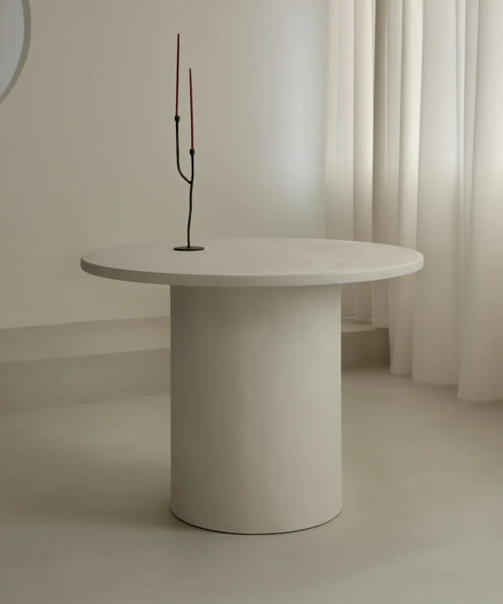 Fabricada en microcemento con un acabado en blanco roto, ofrece una presencia suave y natural. Su textura continua y superficie lisa le dan un aspecto uniforme y sofisticado, integrándose fácilmente en comedores modernos, minimalistas o con un aire industrial.