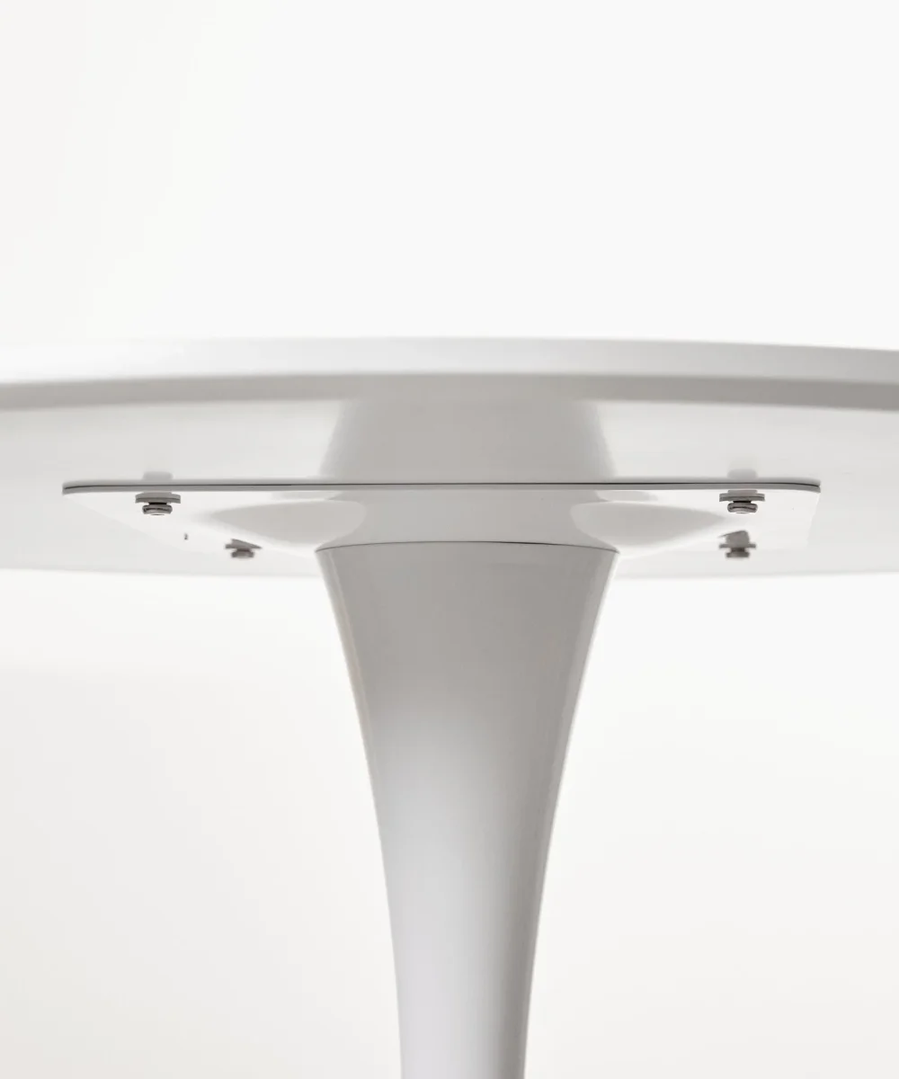 La mesa Tulia redonda es un icono del diseño moderno, reconocible por su base central estilizada en forma de cáliz. Su estética minimalista y fluida elimina las patas tradicionales, aportando ligereza visual y mayor comodidad al sentarse.