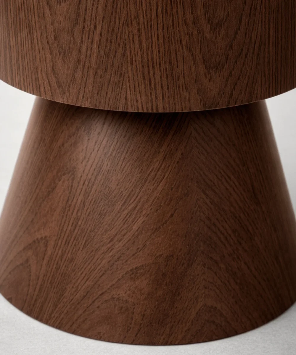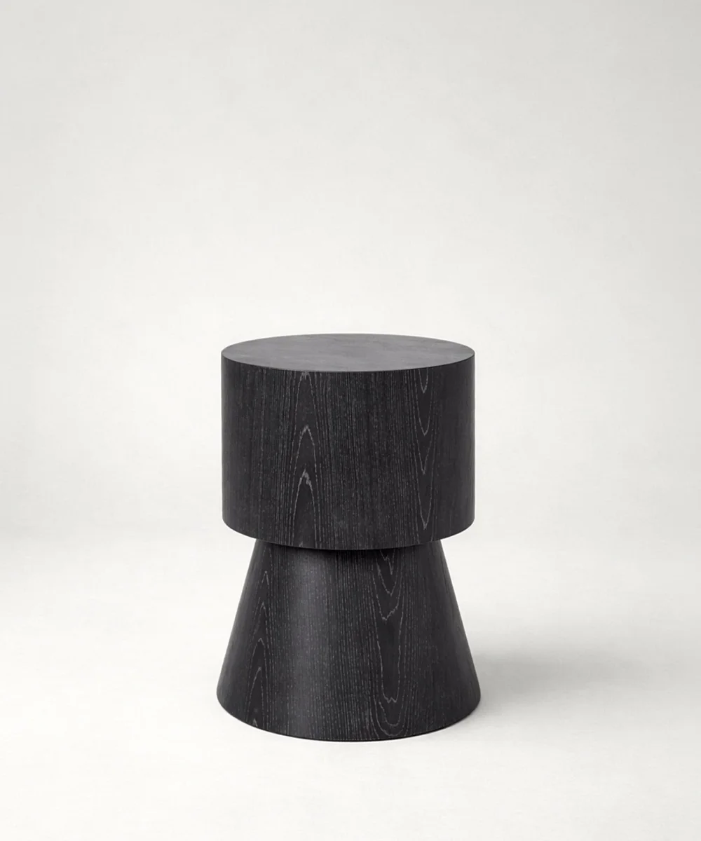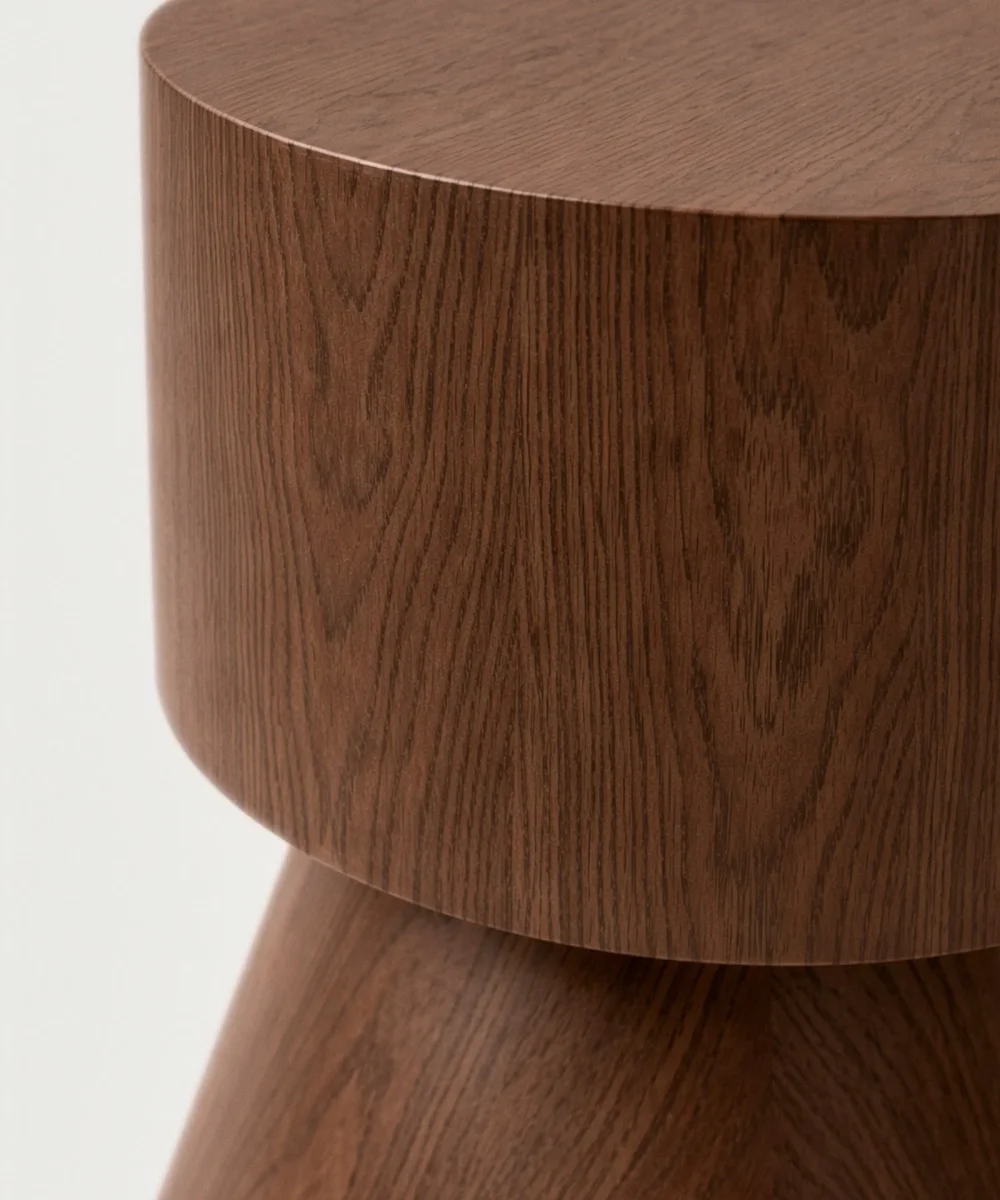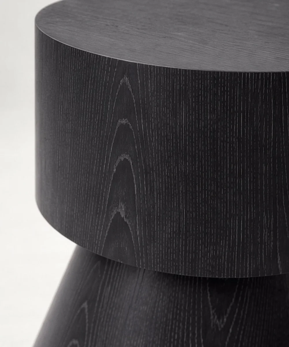 La mesa auxiliar Levi destaca por su diseño minimalista y su sólida construcción en madera, aportando calidez y naturalidad a cualquier espacio. Su silueta geométrica, con base cónica y sobre cilíndrico, la convierte en una mesa auxiliar moderna de estética limpia y contemporánea.