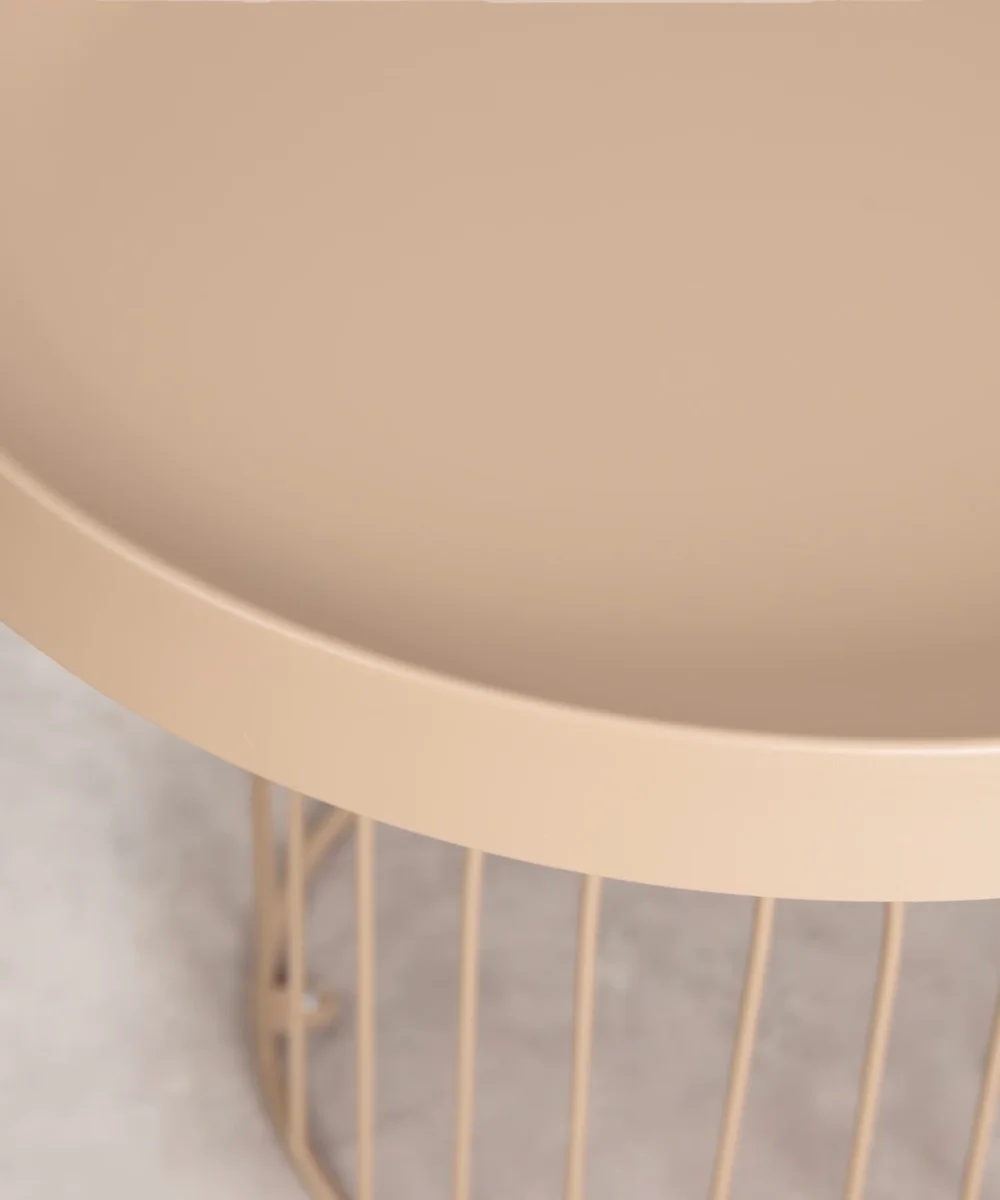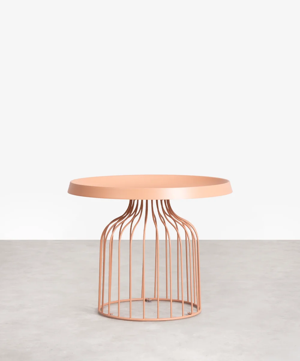 Fabricada en metal de alta calidad. Su base está compuesta por finas varillas de metal dispuestas en forma de jaula, creando una estructura abierta y aireada. El tablero redondo y minimalista ofrece una superficie amplia y estable.