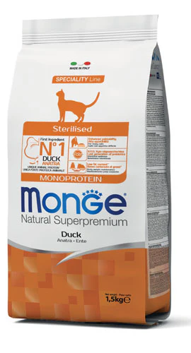 Questo prodotto è adatto ai gatti sterilizzati? Sì, Monge Natural Superpremium Sterilised Monoprotein con Anatra è specificamente formulato per gatti adulti sterilizzati.