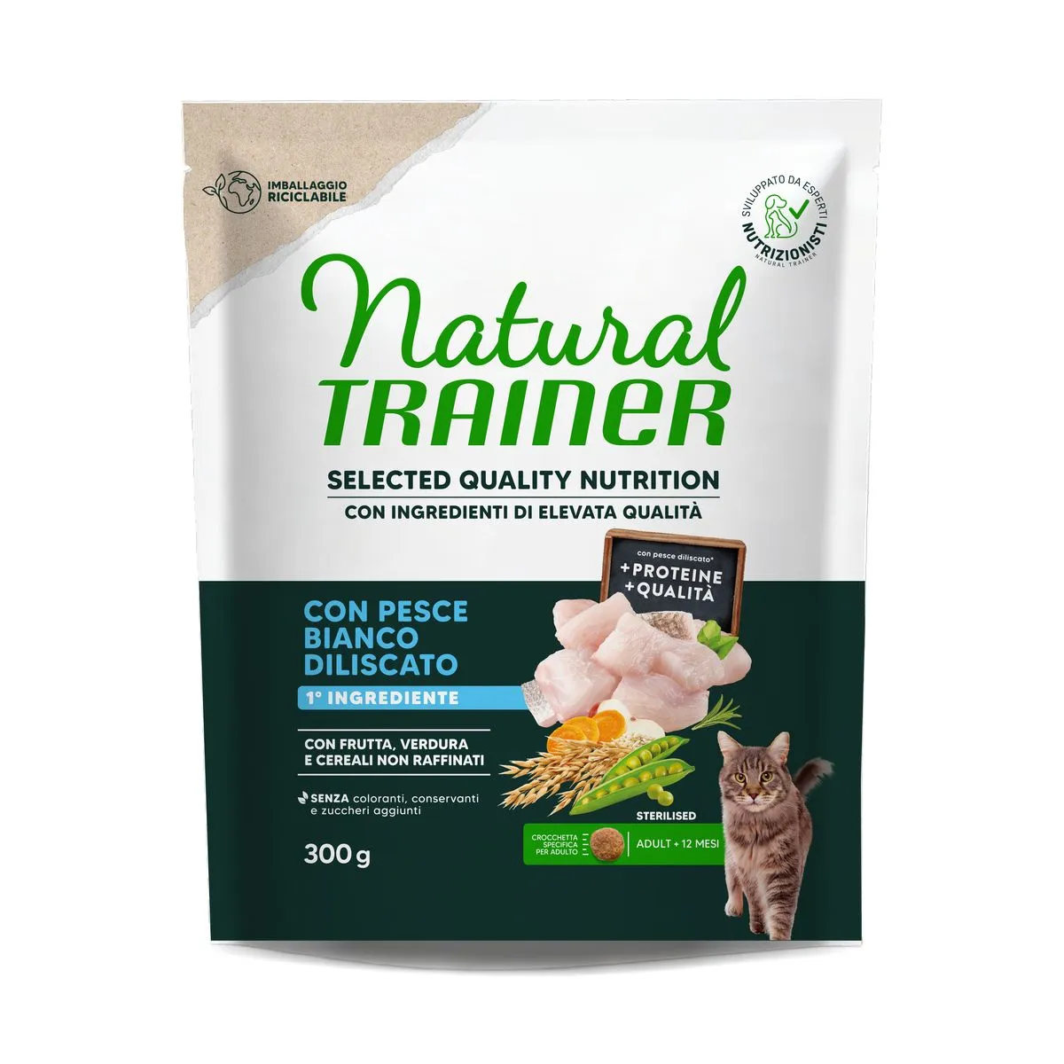 Natural Trainer Selected Quality Nutrition Adult Sterilised Con Pesce Bianco Diliscato Gatto 300 Gr 0,3 Kg / 300 Gr è un alimento secco completo ed equilibrato per gatti adulti sterilizzati da 1 anno d’età. È pensato per chi cerca crocchette pratiche da usare ogni giorno, con una ricetta al pesce adatta alla routine del gatto di casa. Il formato da 300 g è comodo per una prima prova, per una piccola scorta o per avere sempre una confezione pronta. Le crocchette vanno introdotte gradualmente, adattando la razione in base a età, condizione fisica, livello di attività e clima. Lascia sempre acqua fresca e pulita a disposizione e richiudi bene la confezione dopo l’apertura, conservandola in luogo fresco e asciutto.
