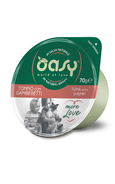 Oasy More Love Tonno con Gamberetti 70 g è un alimento complementare per gatti adulti, pensato per chi vuole inserire varietà e gusto a base di pesce nella routine alimentare del proprio micio. La ricetta combina 70 % tonno, con l’aggiunta di 5 % gamberetti, 1 % riso ed 1 % aroma naturale, il tutto in salsa leggera o acqua di cottura, con umidità elevata. La formula è senza glutine, senza coloranti, aromi o conservanti artificiali, e mira a offrire equilibrio e appetibilità in ogni porzione.