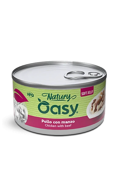 Offri al tuo gatto un pasto ricco, nutriente e irresistibile con OASY WET CAT Natury Soft Jelly – Pollo con Manzo, un alimento umido in lattina da 85g che unisce ingredienti 100% naturali e sapori decisi. Questa ricetta è preparata con pollo di alta qualità, leggero e facilmente digeribile, abbinato al manzo, carne rossa ricca di ferro e proteine che supportano la vitalità e la salute muscolare del gatto. Il tutto è servito in una gelatina morbida, perfetta per stimolare l’appetito e favorire l’idratazione, particolarmente utile nei gatti che consumano poca acqua. Senza coloranti, conservanti o aromi artificiali, è l’ideale come alimento complementare da integrare nella dieta giornaliera, per variare i pasti in modo sano e gustoso.