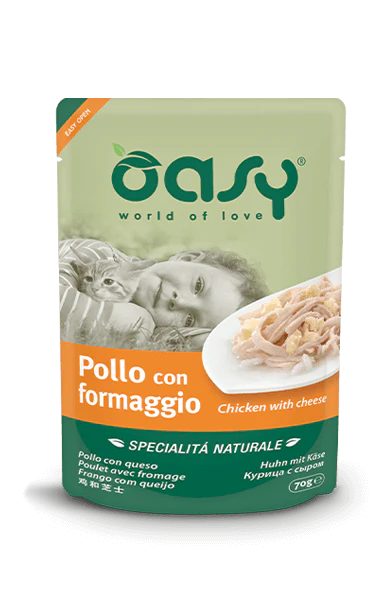 Oasy Specialità Naturale Pollo con Formaggio è un alimento umido complementare per gatti adulti, formulato con ingredienti selezionati per offrire un pasto gustoso e altamente digeribile. Contiene pollo in pezzi con formaggio, immerso in una delicata gelatina che esalta il sapore naturale degli ingredienti.