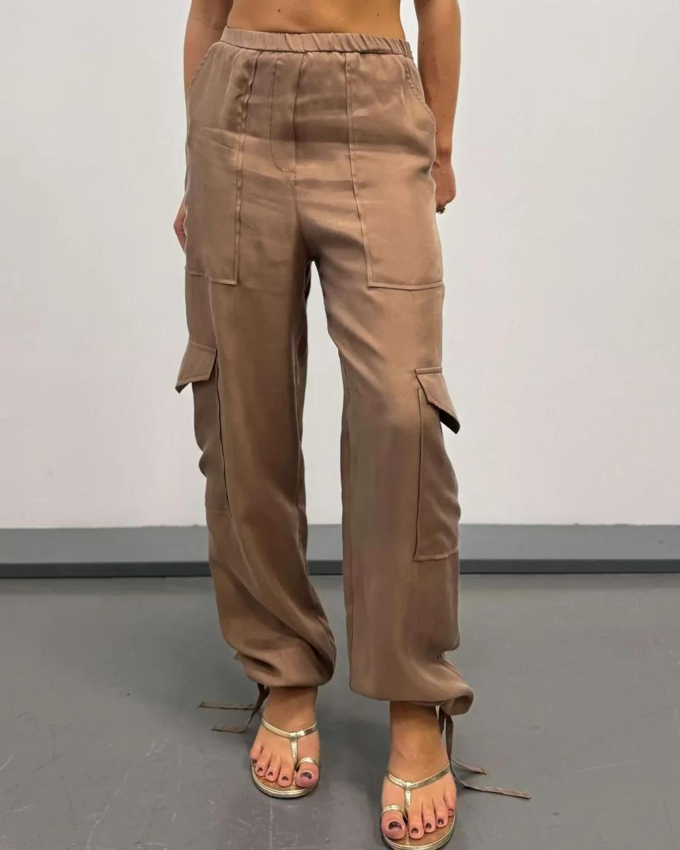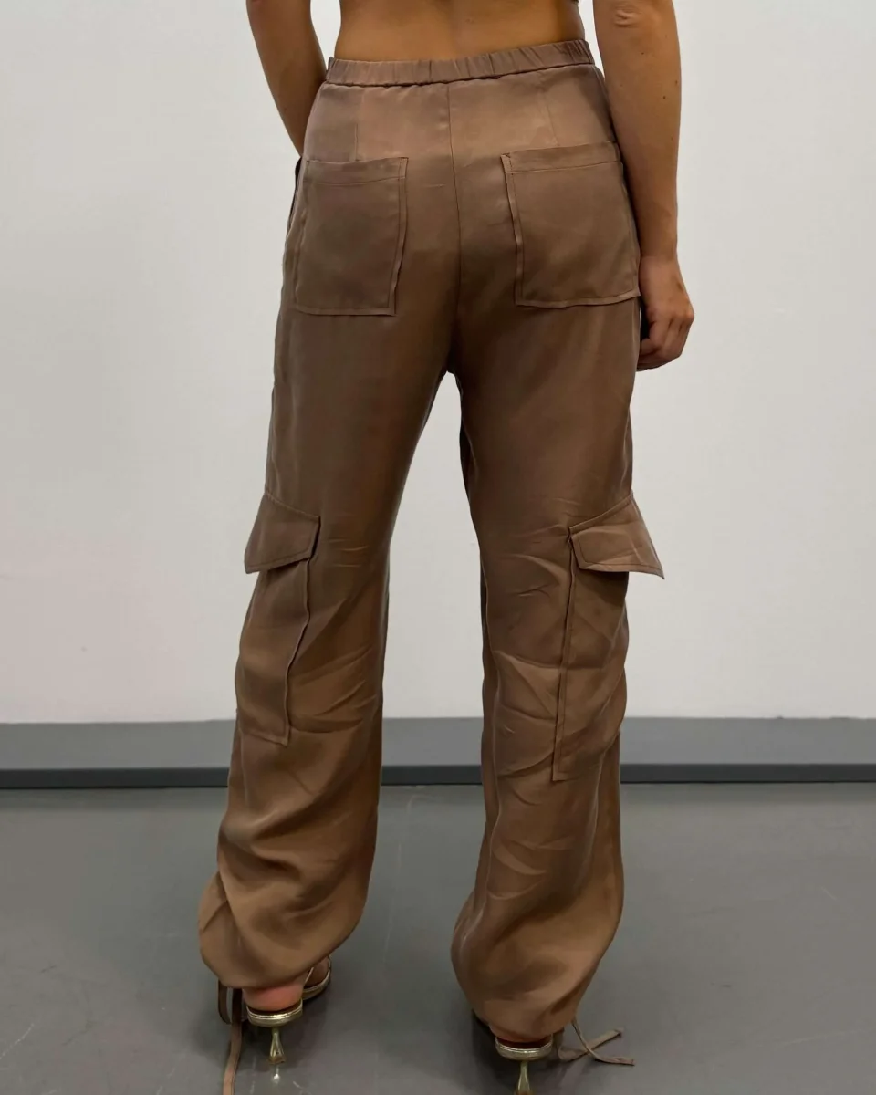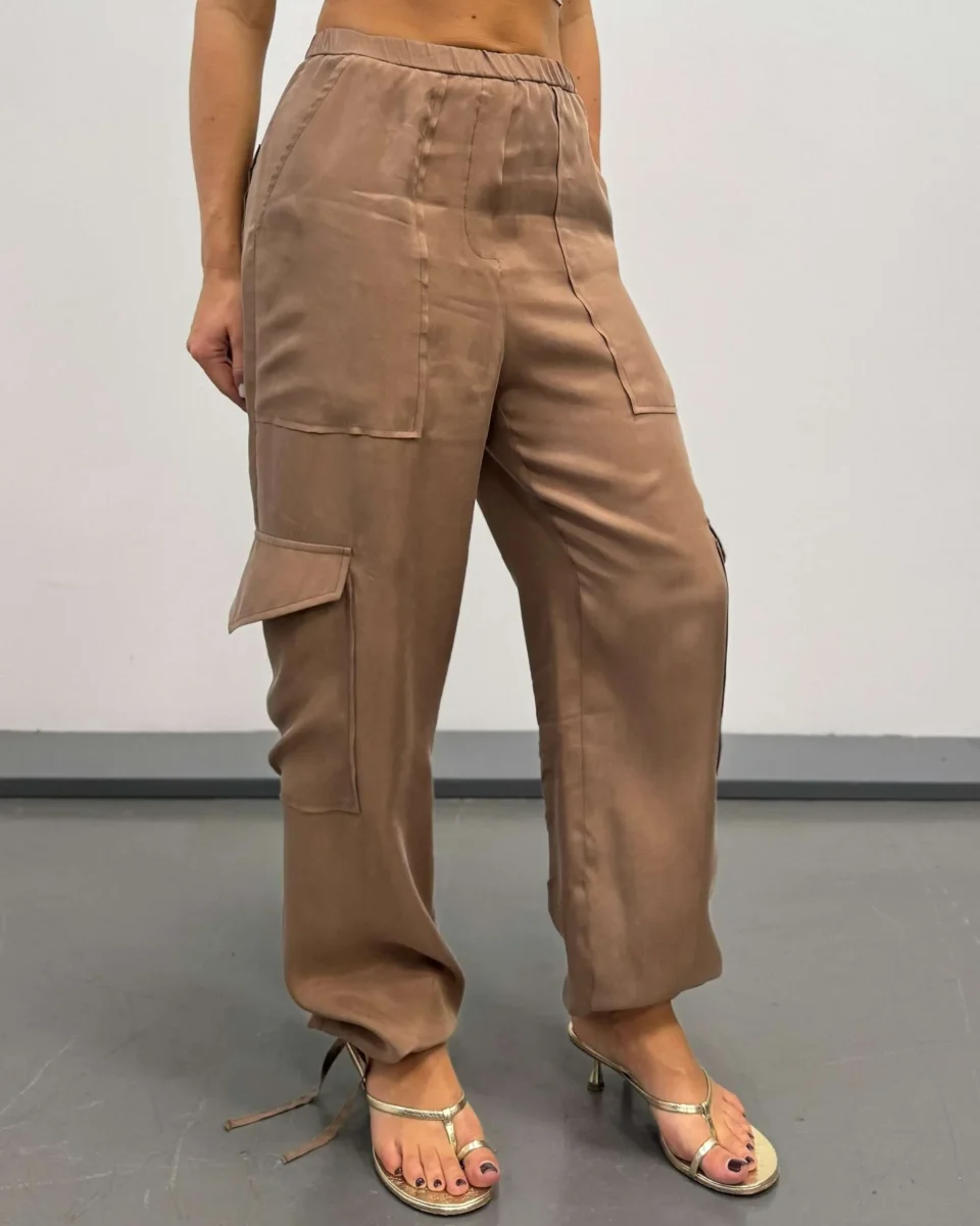 Con tasche anteriori e tasche applicate sulla parte posteriore e sulla gamba. Chiusura laterale con cerniera nascosta nella cucitura.
