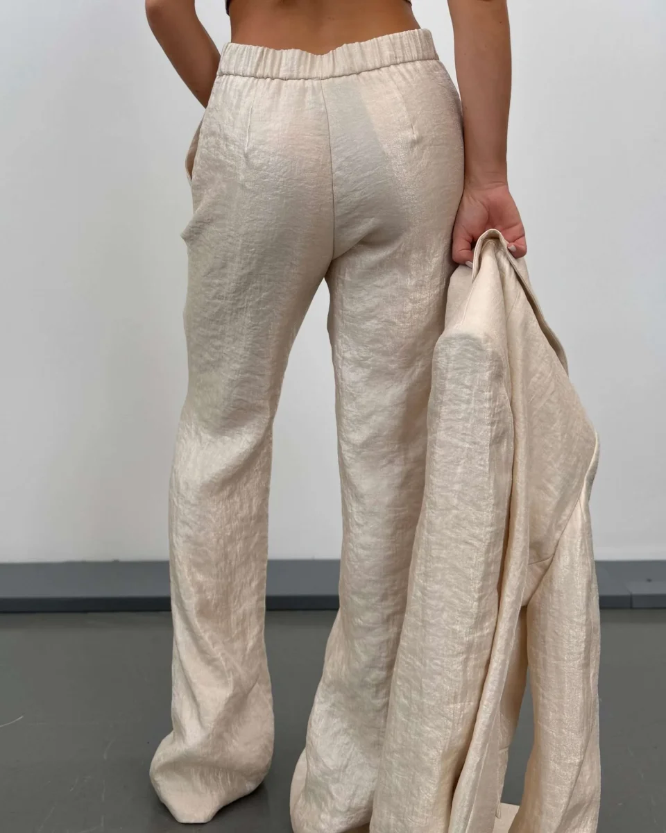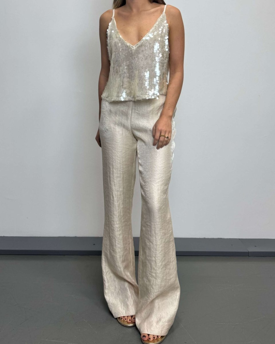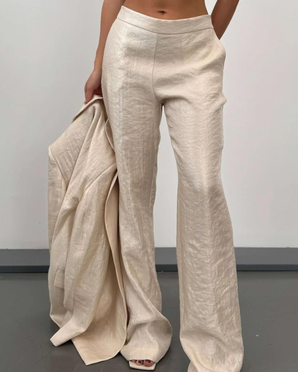 Pantaloni a vita alta con tasche anteriori. Gamba lunga, flare fit.