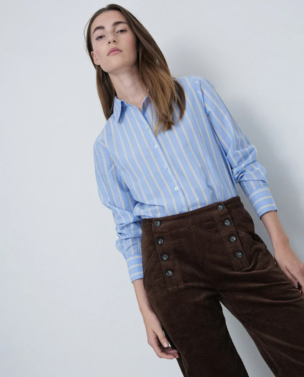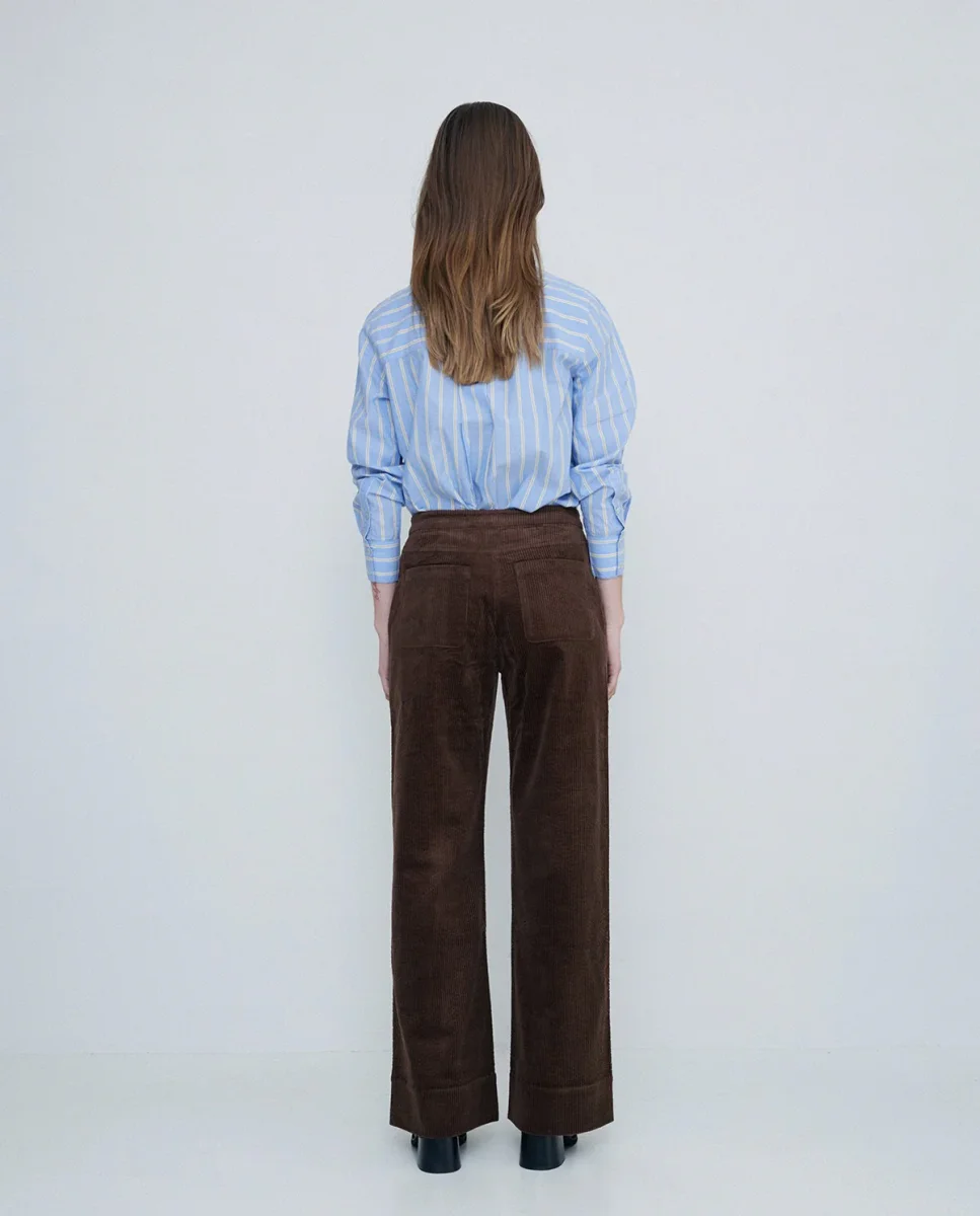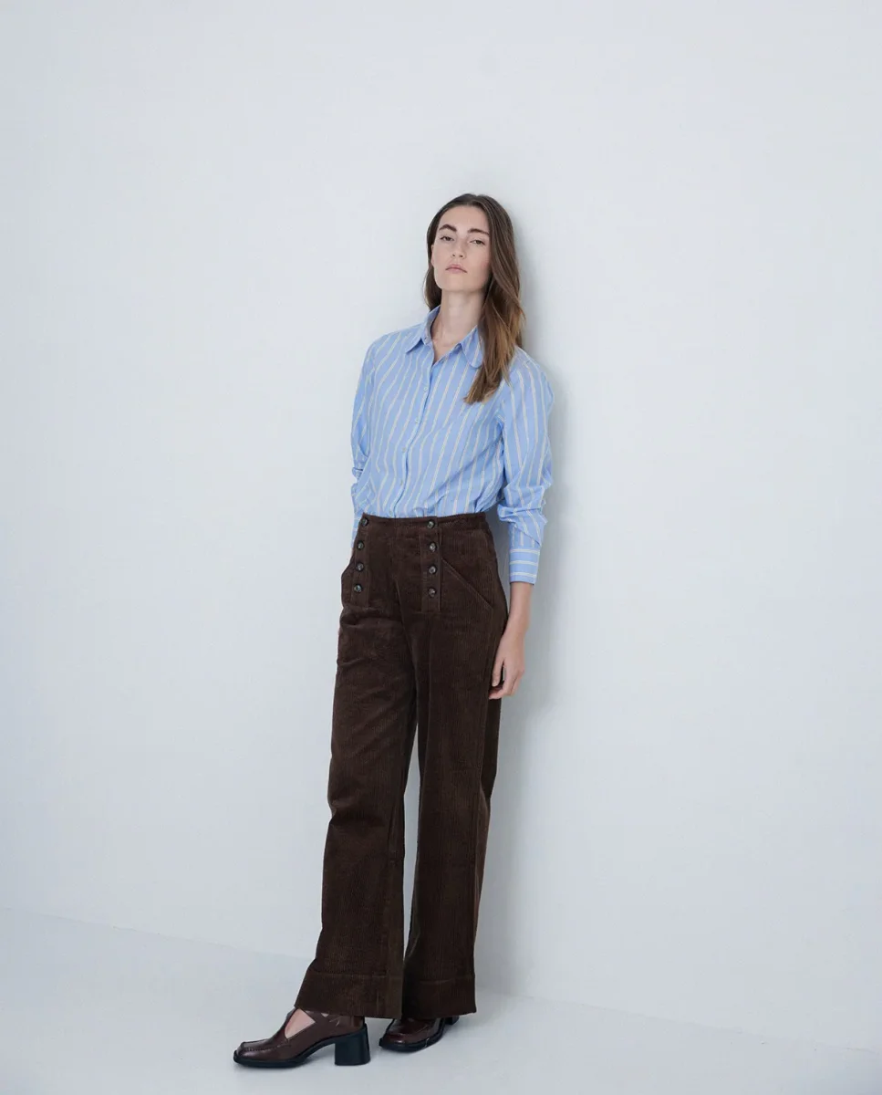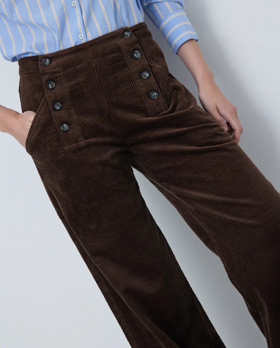 Gamba larga. Velluto a coste. Bottoni sul davanti. Chiusura con bottoni. Tasche laterali.