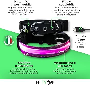 Petty Collare Led Biothane Xs Rosa Cane Xs: Larghezza Nastro 2,0 Cm; Circonferenza Collo 28-33 Cm; Resistenza Dichiarata 102 Kg è un collare LED in Biothane per cane pensato per soggetti di taglia XS con circonferenza collo da 28 a 33 cm. È una soluzione pratica per le passeggiate del mattino presto, della sera o nelle giornate con poca luce, quando avere più visibilità nella routine quotidiana aiuta a gestire le uscite con maggiore serenità. La ricarica tramite USB Type-C rende l’utilizzo semplice, mentre il materiale è progettato per resistere ad acqua e intemperie. La pulizia richiede solo un panno umido. Per una vestibilità più comoda, è consigliato misurare il collo del cane e aggiungere circa 2 o 3 cm.