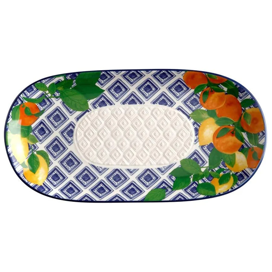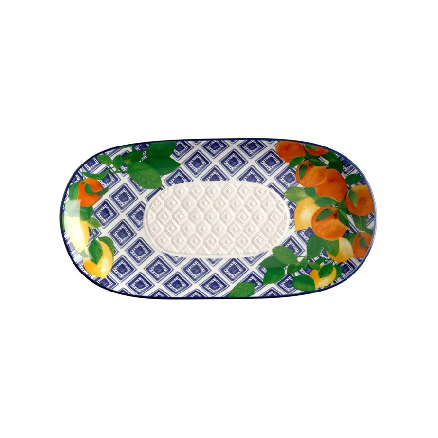 Realizzato con cura e decorato a mano, questo piatto ovale trasmette un’atmosfera di raffinata eleganza, con la sua fascia blu mare e i tralci di agrumi che richiamano le meraviglie paesaggistiche del sud d’Italia. Ogni dettaglio è stato attentamente studiato per offrire un’esperienza culinaria indimenticabile, rendendo ogni pasto un’occasione speciale.