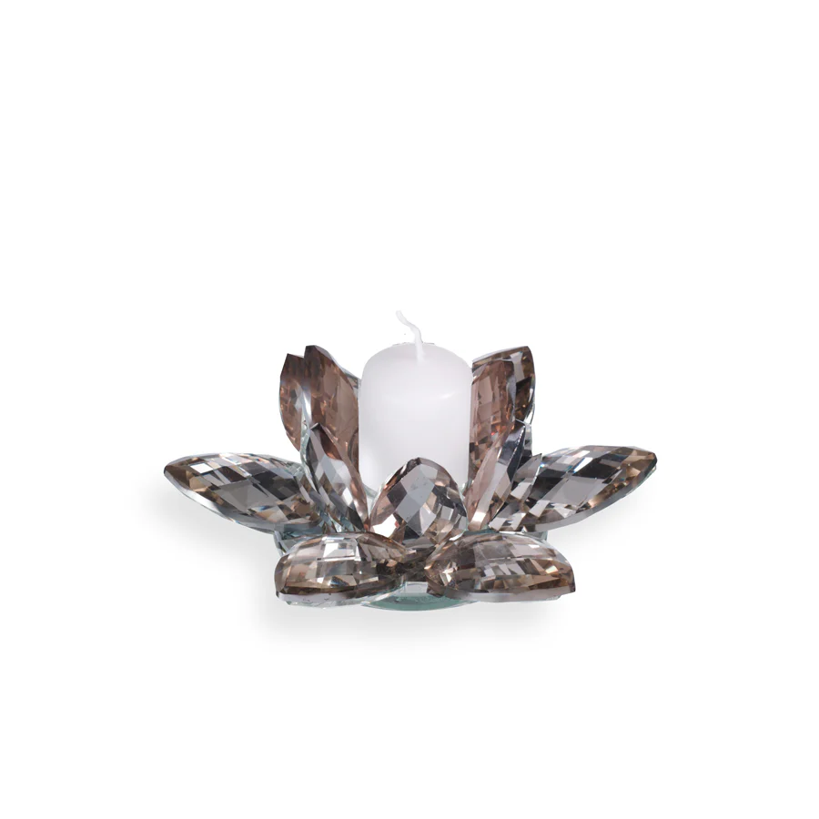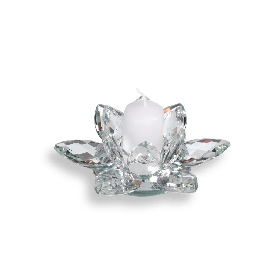 Realizzato in cristallo di alta qualità, questo portacandele ha la forma di un fiore di loto, simbolo di purezza e serenità, che aggiunge un tocco di sofisticazione e tranquillità a qualsiasi ambiente.