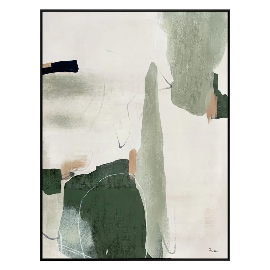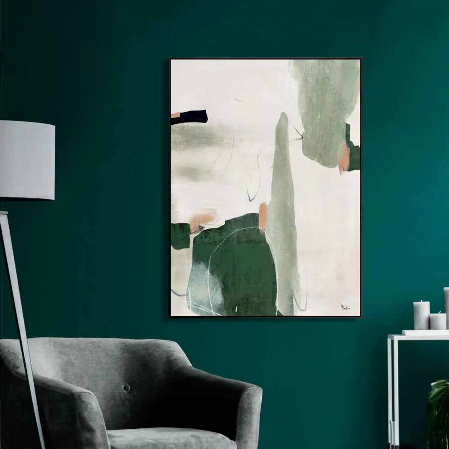 Il design astratto si fonde armoniosamente con le sfumature di verde, evocando immagini di giardini e paesaggi naturali, rendendo questo quadro ideale per gli amanti della natura e dell’arte contemporanea. La cornice elegante completa l’opera, conferendole un aspetto raffinato e sofisticato, perfetto per arredare salotti, uffici o stanze da letto.