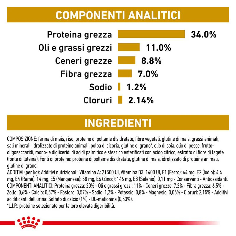 Farina di mais, riso, proteine di pollame disidratate, fibre vegetali, glutine di mais, grassi animali, sali minerali, idrolizzato di proteine animali, polpa di cicoria, glutine di grano*, olio di soia, olio di pesce, frutto-oligosaccaridi, mono- e digliceridi degli acidi palmitico e stearico esterificati con acido citrico, estratto di fiore di tagete (fonte di luteina). Fonti di proteine: proteine di pollame disidratate, glutine di mais, idrolizzato di proteine animali, glutine di grano.