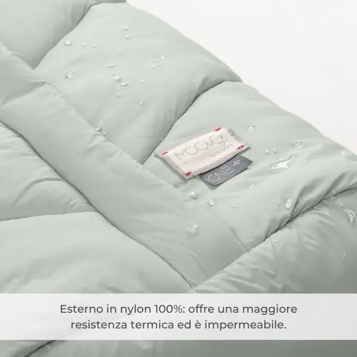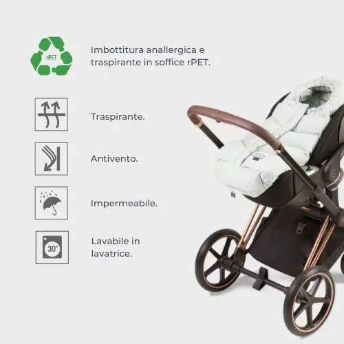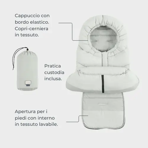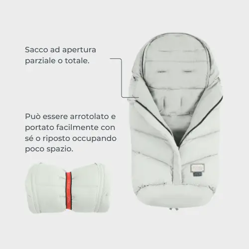 One+ è il sacco passeggino più completo in quanto offre una protezione estrema contro le temperature più rigide (fino a -18°), garantendo che il bambino rimanga sempre caldo e asciutto.