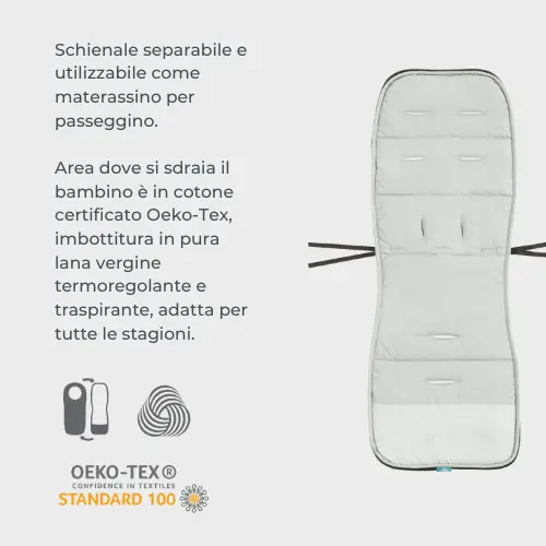 La parte frontale del sacco inverno passeggino si stacca e lo schienale, in pura lana termoregolante all’interno e cotone all’esterno, mantiene sempre la temperatura ideale del corpo per offrire un comfort superlativo durante ogni viaggio.