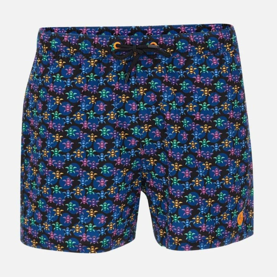 Fai un tuffo nello stile animal-free dell’estate con la stampa colorata del costume da bagno Ademir. Comodo da indossare grazie alla fodera in rete e alla vita elastica con coulisse, ha tasche laterali e una sul retro. Il logo arancione sul fondo gamba, i terminali arancioni dei lacci e il dettaglio a forma di becco sulla tasca posteriore completano il modello con il distintivo tocco Save The Duck.