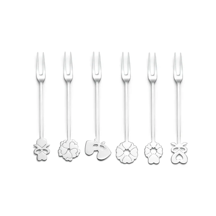 Il Set 6 Forchettine Aperitivo in acciaio “LOVE” porta sulla tavola un messaggio romantico ed elegante. Ogni forchettina lunga 13cm è impreziosita da un decoro sulla sommità dell’impugnatura che parla il linguaggio del cuore, attraverso nodi d’amore, fiori e cuoricini reinterpretati con un segno grafico contemporaneo.