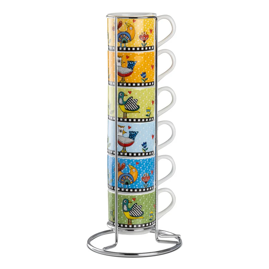 Ogni set include 6 tazzine, ognuna accompagnata da un piattino coordinato, per un totale di 12 pezzi. Le tazzine sono disponibili in tre vivaci colori, ognuno decorato con un grazioso motivo di margherite su un fondo colorato.