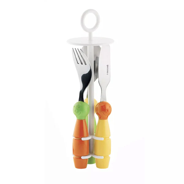 La sicurezza è una priorità: le lame dei coltelli e i rebbi delle forchette sono arrotondati per evitare incidenti, mentre i manici a forma di birillo garantiscono una presa salda.