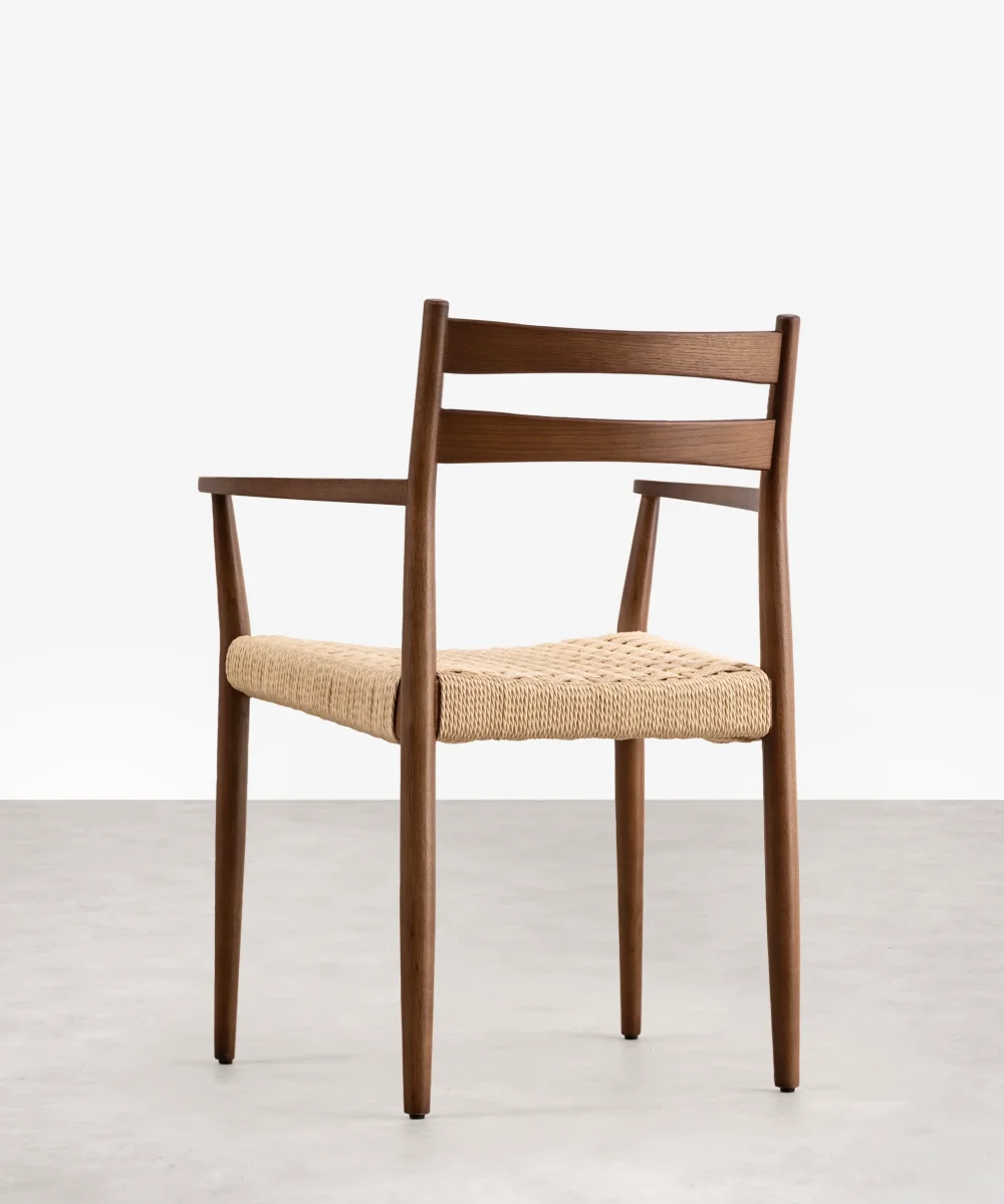 Está fabricada con una estructura de madera de roble maciza y un asiento trenzado a mano con cuerda natural ecológica. Cada silla Nona Arms es una pieza única, cuidadosamente elaborada por artesanos para garantizar la más alta calidad y durabilidad.