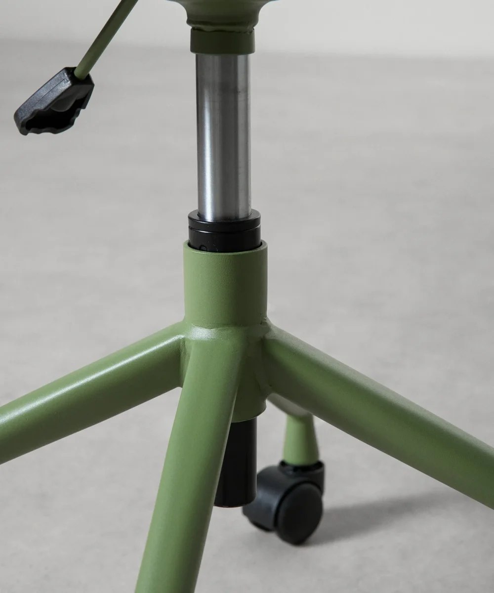 Las patas metálicas con acabado en color a juego garantizan estabilidad y un estilo uniforme, mientras que las ruedas giratorias y el sistema de altura regulable aportan funcionalidad y movilidad.