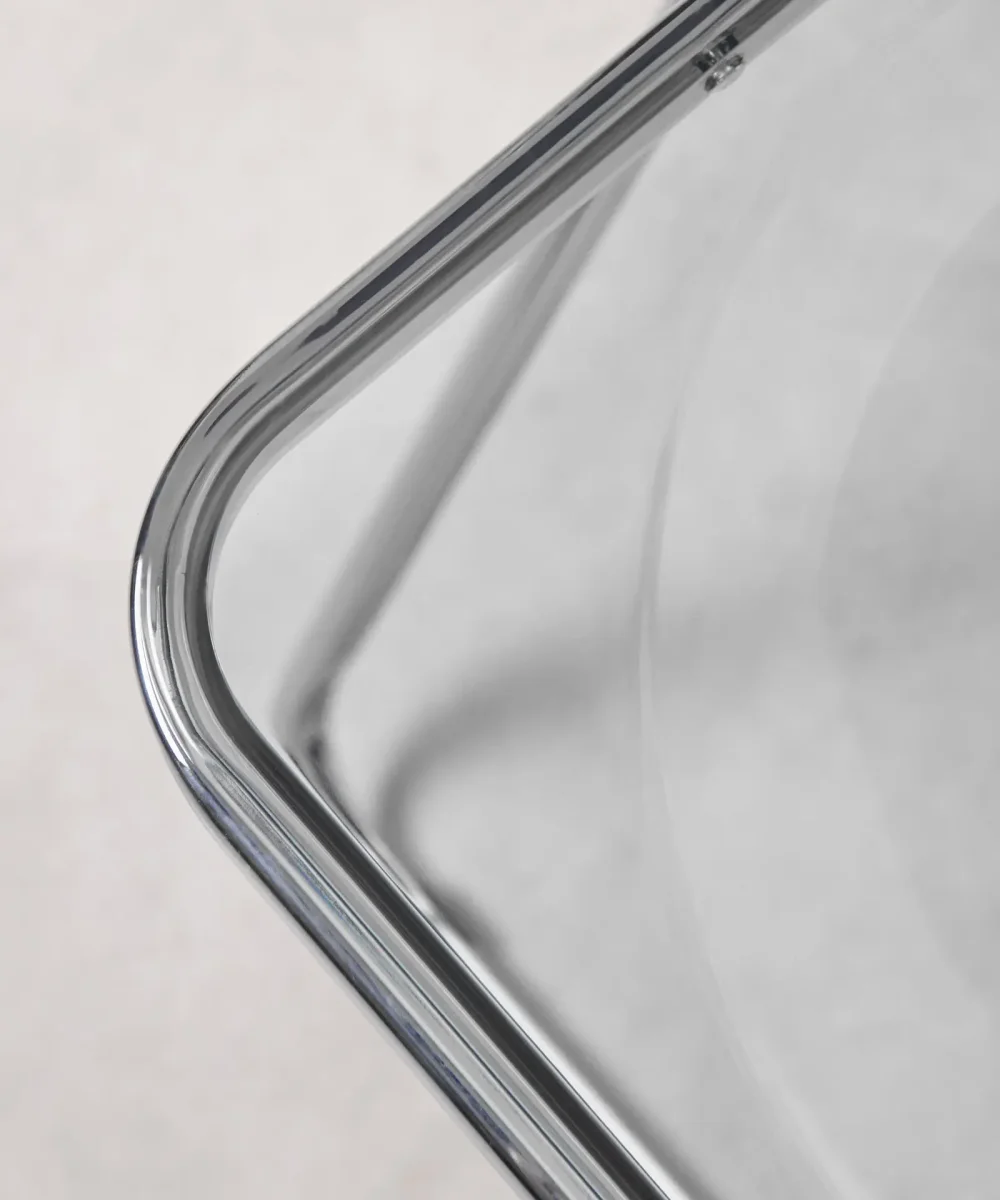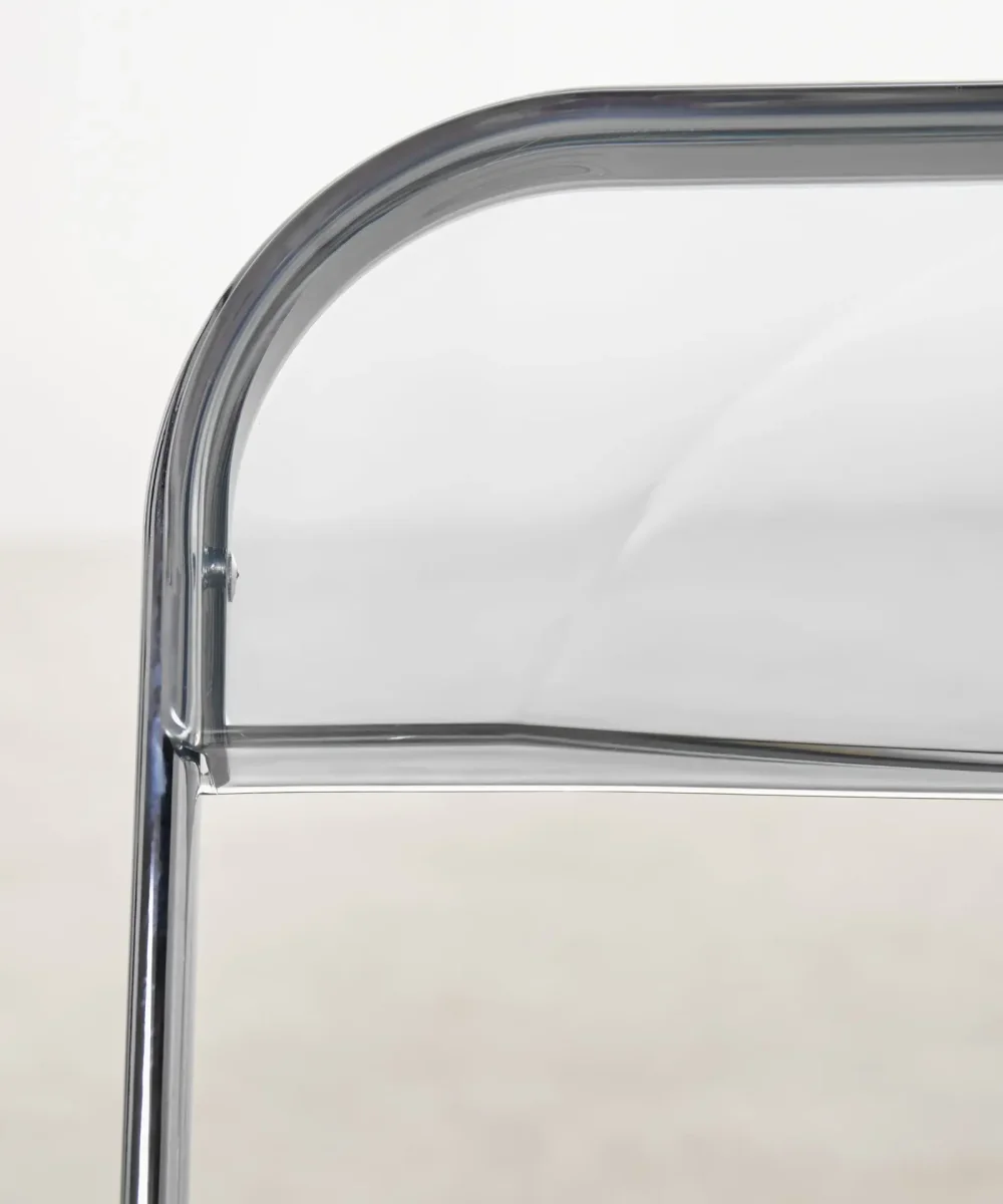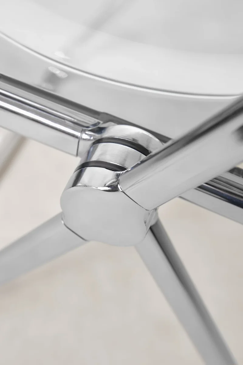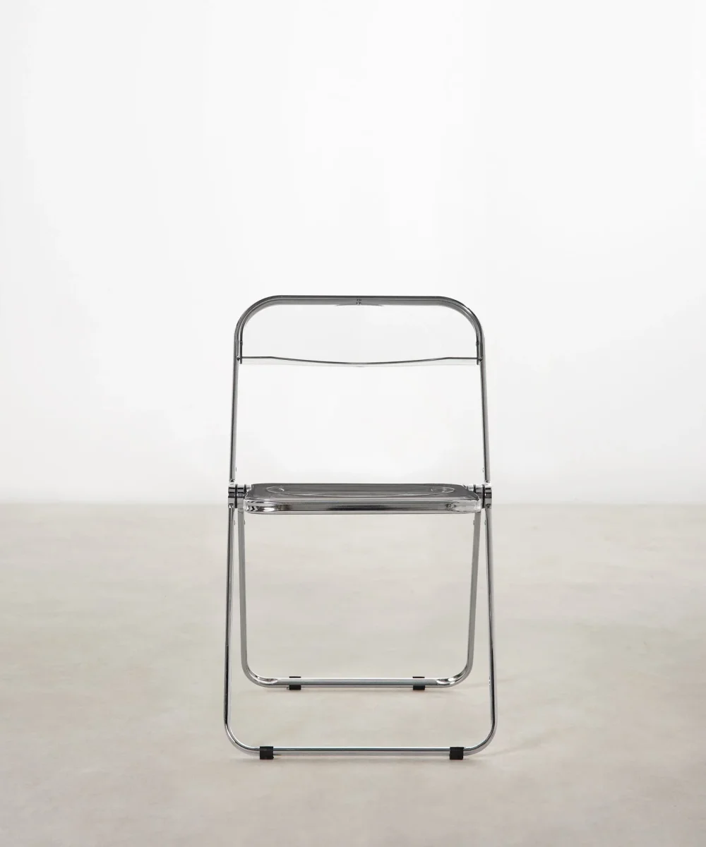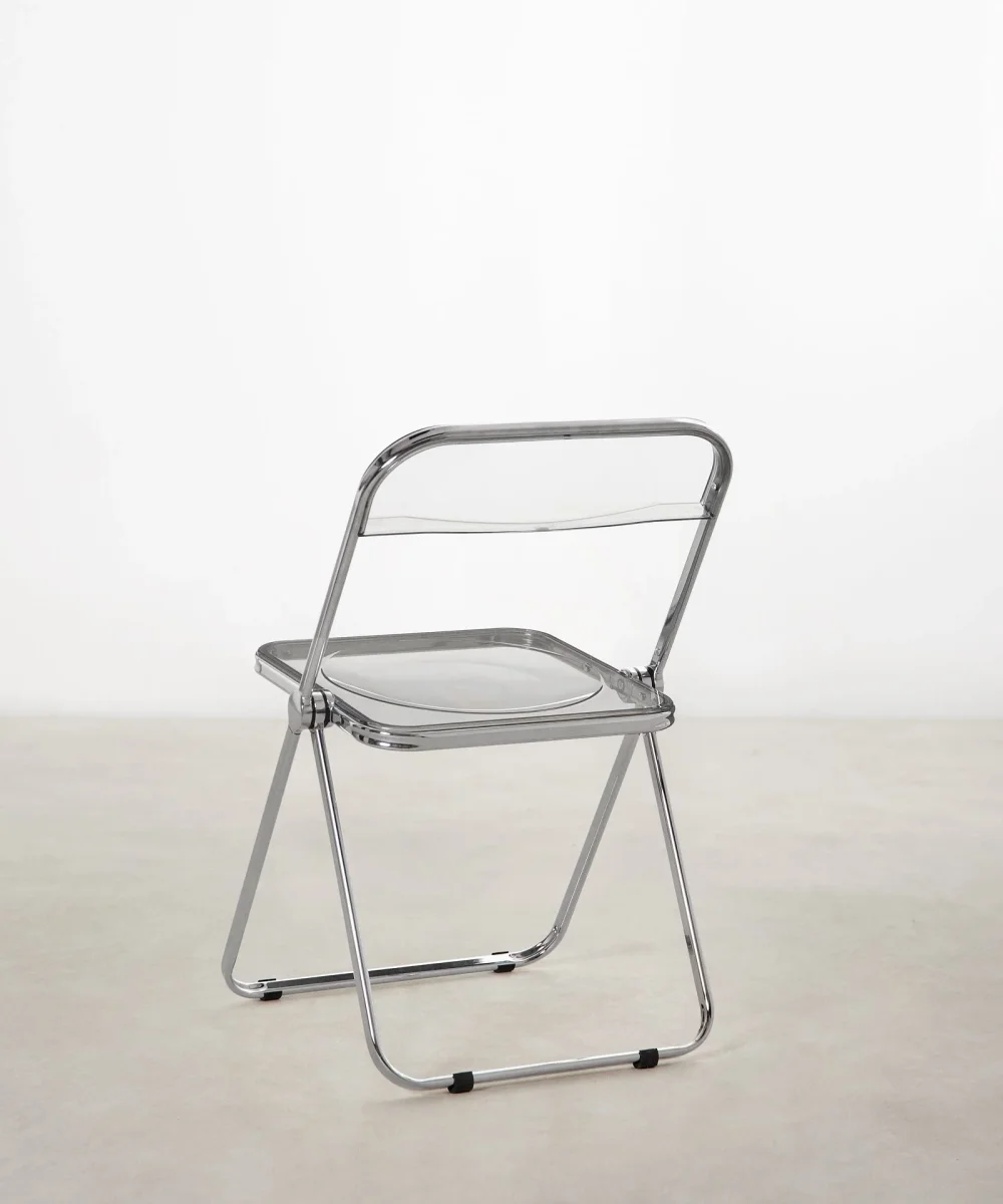La silla Luma combina diseño ligero y funcionalidad en un solo gesto. Su estructura plegable de acero cromado aporta un aire contemporáneo y práctico, mientras que el asiento y respaldo translúcidos añaden ligereza visual al espacio.