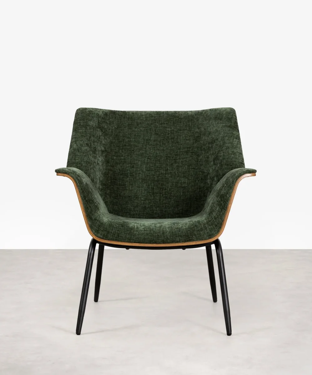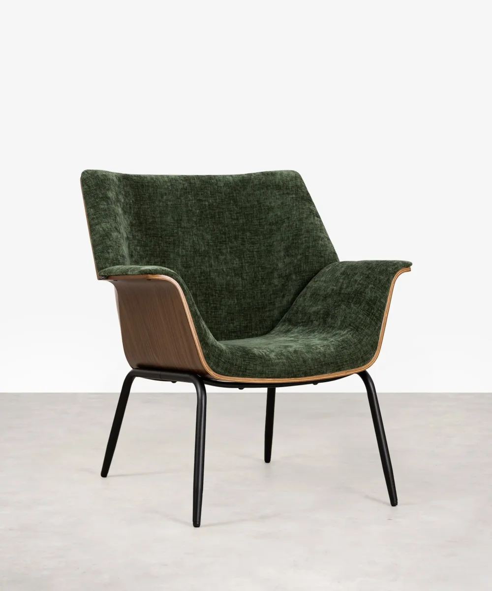 El sillón Romi tiene un diseño retro que destaca por sus líneas limpias y una estructura robusta en madera de nogal y acero negro. El respaldo y los apoyabrazos están suavemente curvados, brindando una experiencia de confort excepcional.
