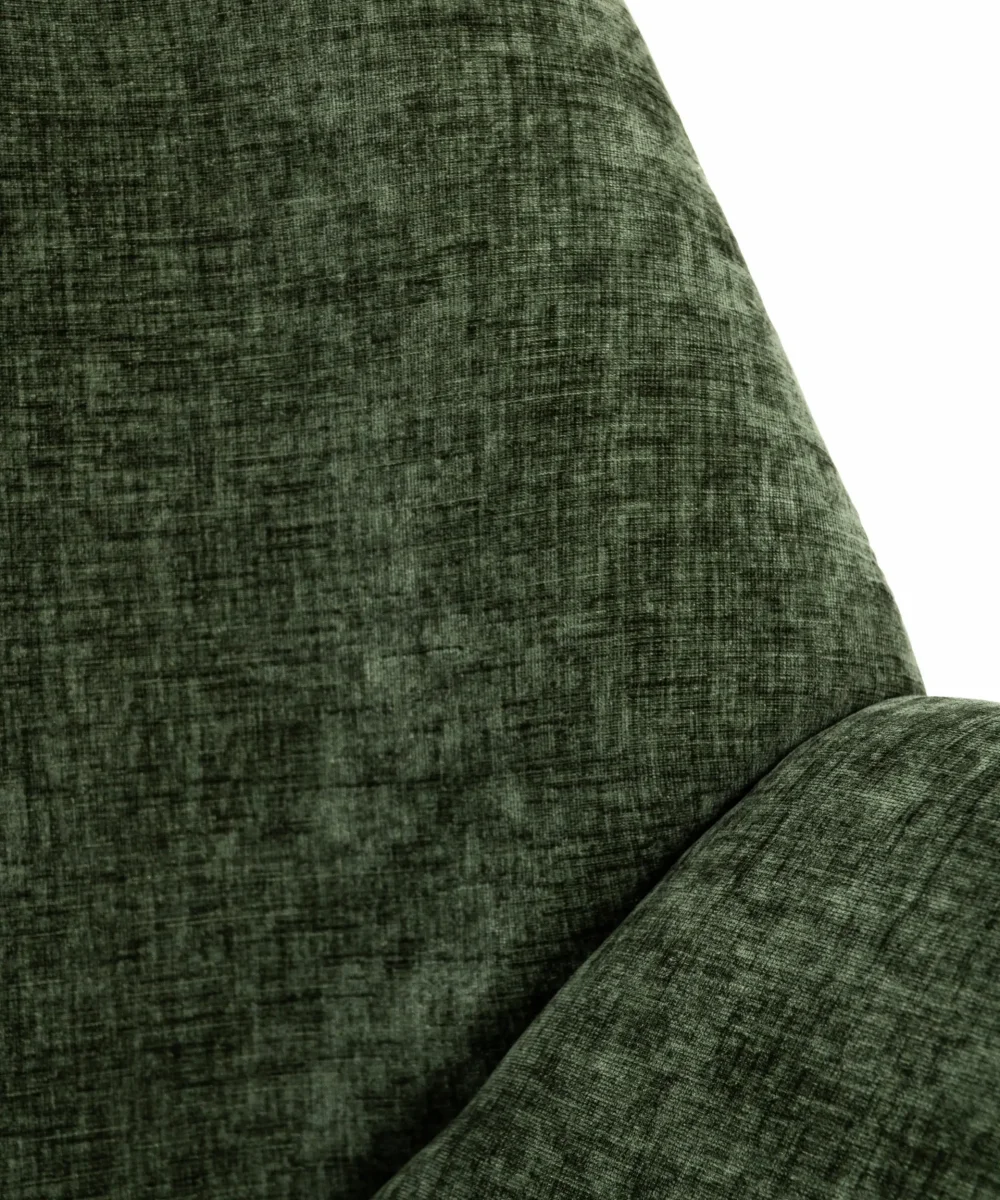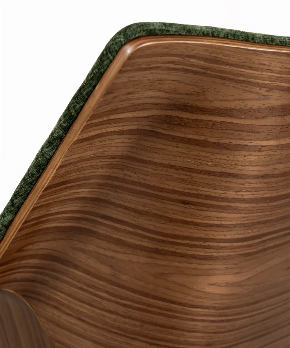 El asiento y el respaldo están tapizados en un tejido de máxima calidad, que no solo aporta una sensación de lujo, sino que también es suave al tacto y fácil de mantener. La base de madera de tono oscuro añade calidez y contraste al diseño.