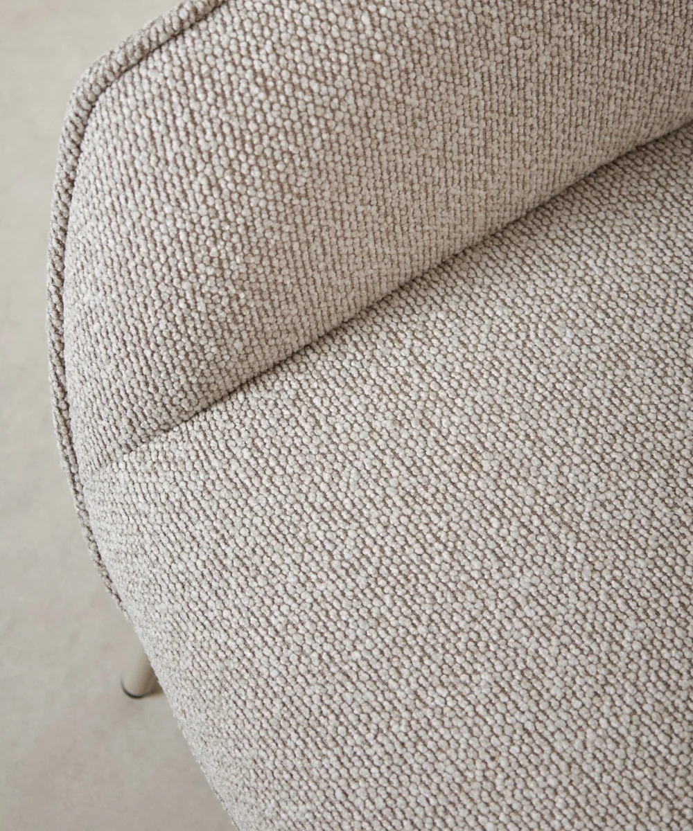 El tapizado en tejido bouclé aporta una estética serena y atemporal, ideal para interiores contemporáneos o escandinavos. Destaca su diseño capitoné con costuras decorativas, que aportan un toque de sofisticación.