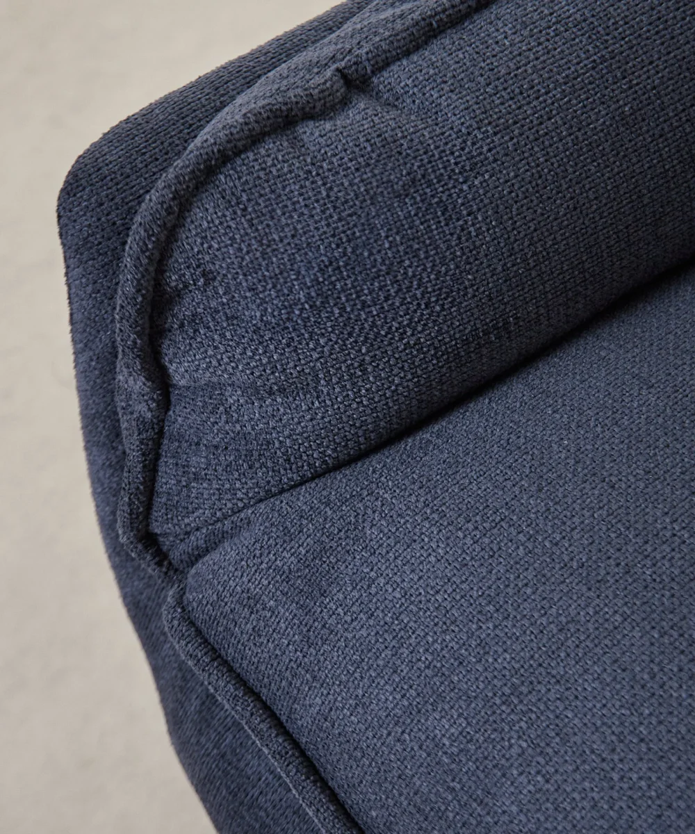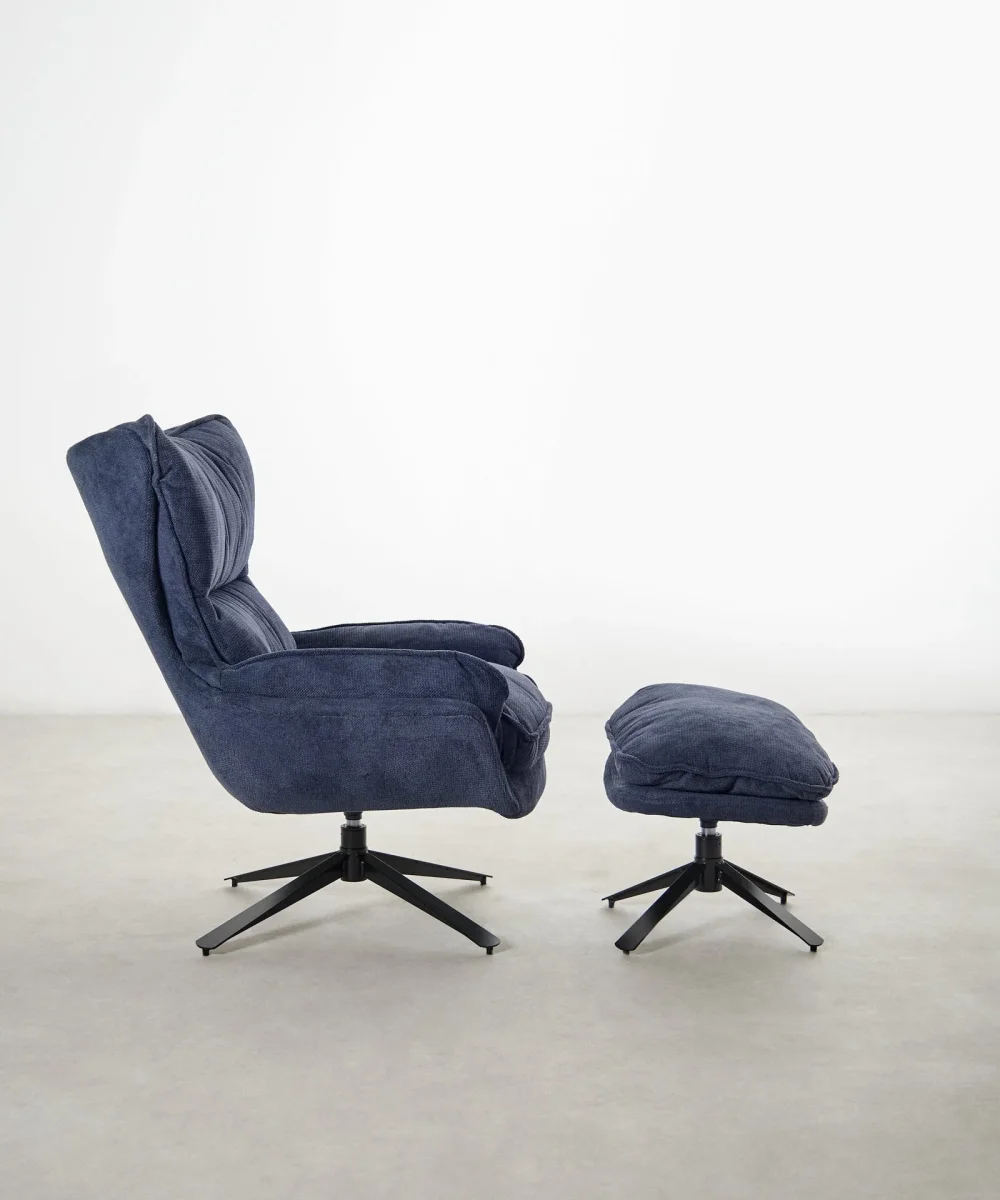 Está disponible en dos tonalidades versátiles: azul profundo y beige claro, ambas tapizadas en un tejido suave tipo pana que añade textura y calidez al ambiente. Incluye reposapiés a juego, lo que potencia aún más la comodidad y completa su funcionalidad.